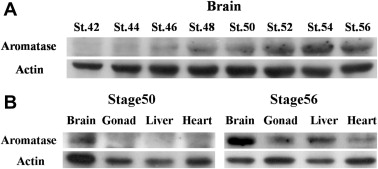 Expression patterns of aromatase protein in Xenopus at the larval stage. Western blotting analysis was performed using anti-aromatase antibody and anti-actin antibody as an internal standard. Mix of nuclear and cytosolic extracts from the mixture of ZZ and ZW brains at stages 42, 44, 46, 48, 50, 52, 54, and 56 (A) and brain, gonads, liver, and heart at stages 50 and 56 (B) were examined by immunoblotting with each primary antibody followed by an HRP-conjugated anti-mouse or rabbit IgG antibody.