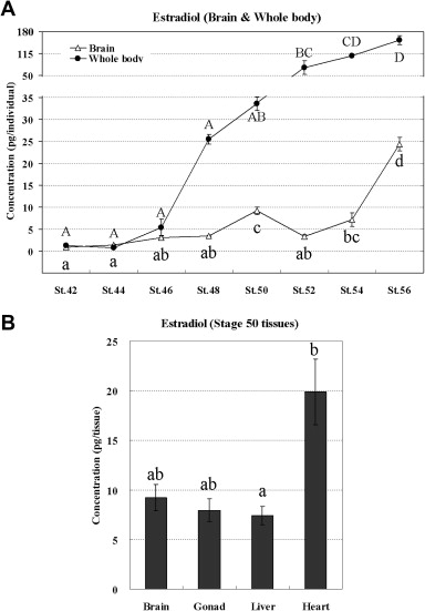 Time course and tissue distribution of estradiol (E2) concentration in Xenopus at the larval stage. E2 concentrations were quantified in the mixture of ZZ and ZW brains or the whole body at stages 42, 44, 46, 48, 50, 52, 54, and 56 (A) and brain, gonads, liver, and heart at stage 50 (B). Each point presents mean ± SE (n ⩾ 3) of E2 concentration in pg per brain or individual (A) or tissue (B).