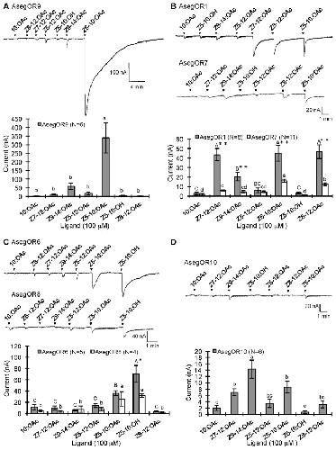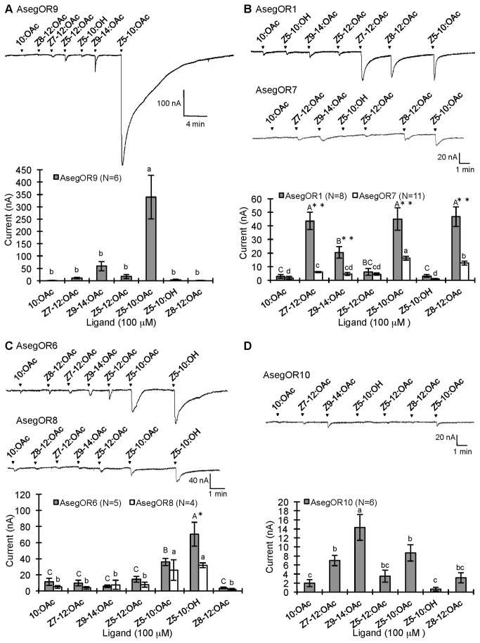 Figure 2. Distinct response profiles of the six AsegOR paralogues from Cluster I.Response profiles of (A) AsegOR9, (B) AsegOR1 and AsegOR7, (C) AsegOR6 and AsegOR8, (D) AsegOR10. The upper part of each panel indicates current trace of injected oocyte upon successive exposures to 100 μM stimuli. Each chemical was applied at the time point indicated by arrowheads for 20 s. The lower part of each panel indicates mean values ± SE of the stimulated currents in nA. Number of replicates for each receptor is indicated in the legend. Letters above bars represent significant level at p <0.05 (one-way-ANOVA followed a LSD test); single or two asterisks in (B) and (C) represent different sensitivities of two receptors to same ligand (p <0.05 or p<0.01 respectively, t-test).