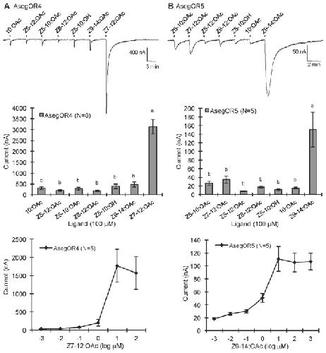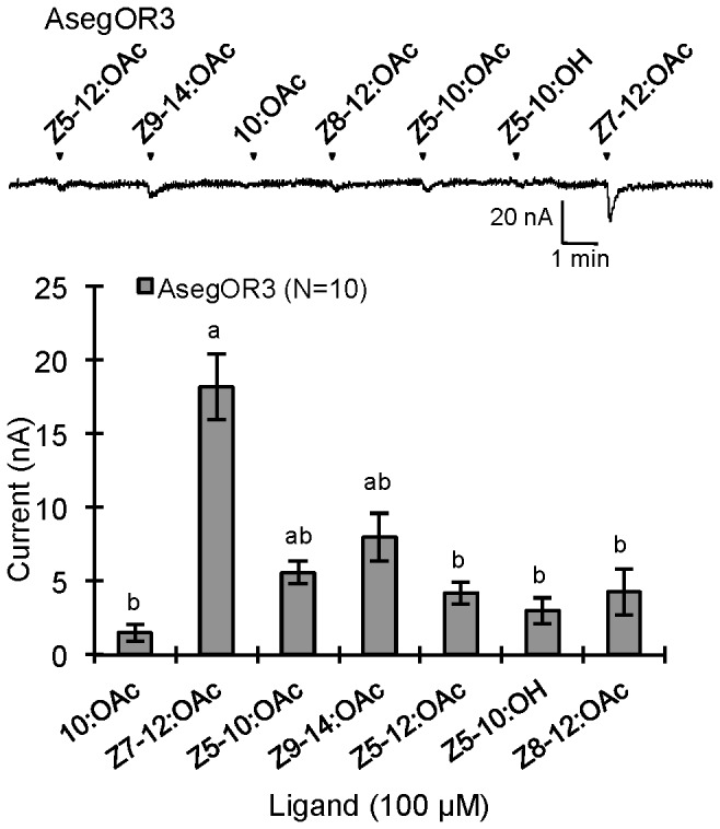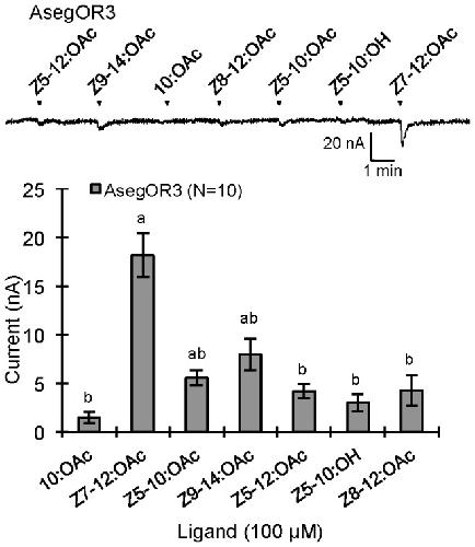 Figure 4. Response profiles and dose responses of AsegOR3.The upper part indicates current trace of injected oocyte upon successive exposures to 100 μM stimuli. Each chemical was applied at the time point indicated by arrowheads for 20 s. The lower indicates mean values ± SE of the stimulated currents in nA, one-way-ANOVA followed a LSD test, p <0.05. Number of replicates for each receptor is indicated in the legend.