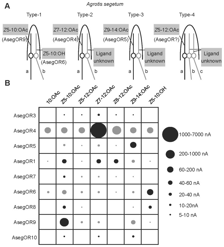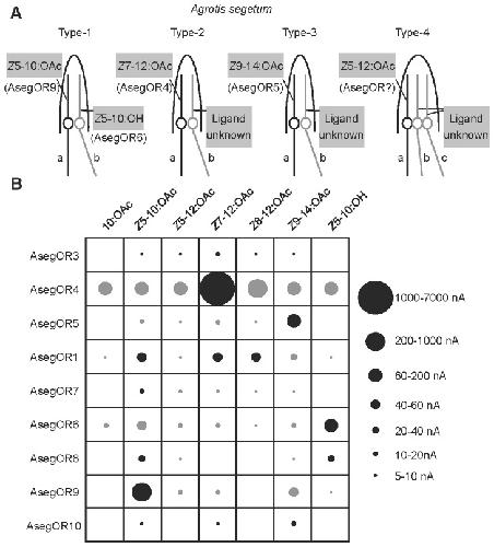 Figure 6. Summary of the response profiles of AsegOR1, AsegOR3-10 and the putative locations of PRs in the ORNs.(A) Representation of ORNs in trichoid sensilla of A. segetum, depicting suggested associations between PRs and ORNs. The different types of ORNs were identified in previous single-sensillum recordings [11-13]. (B) The response profiles of AsegOR1 and AsegOR3-10 in the presence of seven test compounds at a dose of 100 μM. Circles of different sizes represent the response magnitudes. Black circles indicate the responses of the most active ligand(s) of each receptor, whereas grey circles indicate responses evoked by other stimuli.