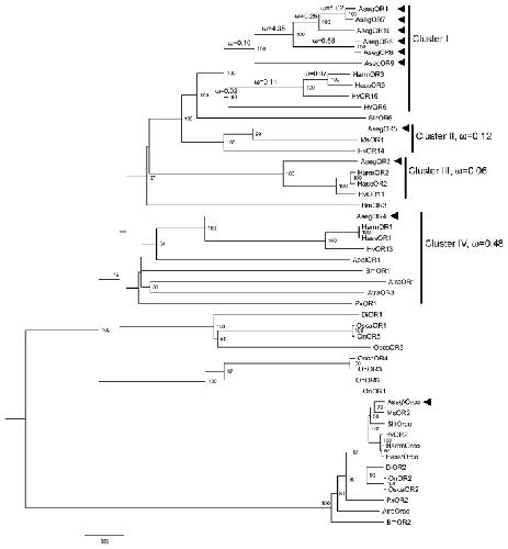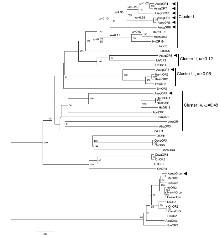 Figure 1. Neighbor-joining phylogenetic tree of AsegORs with functionally identified PR sequences in Lepidoptera.The tree was rooted with Orco lineage in Lepidoptera. Percentage bootstrap support (1000 replicates) values over 50 are shown at corresponding nodes. AsegORs and AsegOR\Orco are indicated with arrowheads. The nonsynonymous (dN) to synonymous (dS) substitution rate (Ï) was labelled in the tree. Cluster II, III and IV have a uniform Ï rate for all branches, as labelled at the right side, whereas Cluster I has various Ï rate for all branches within the lineage, as labelled on the left on each branch. Genbank accession numbers of the protein sequences used in this phylogenetic tree were concluded in Table S2.