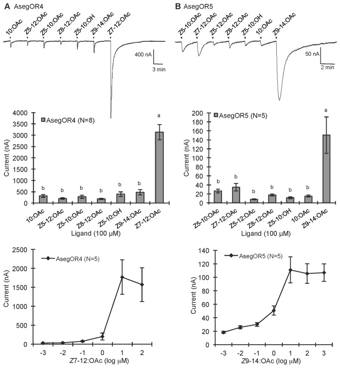 Figure 3. Response profiles and dose responses of (A) AsegOR4 and (B) AsegOR5.The upper part of each panel indicates current trace of injected oocyte upon successive exposures to 100 μM stimuli. Each chemical was applied at the time point indicated by arrowheads for 20 s. The middle part of each panel indicates mean values ± SE of the stimulated currents in nA, one-way-ANOVA followed a LSD test, p <0.05. The lower part of each panel indicates the responses of the receptors at different doses of ligand. Number of replicates for each receptor is indicated in the legend.