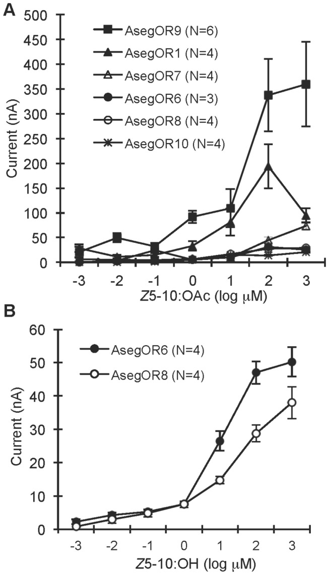 Figure 5. The six AsegOR paralogues from Cluster I vary in ligand sensitivity.(A) The dose responses of the six paralogues to the pheromone component Z5-10:OAc. (B) The dose responses of AsegOR6 and AsegOR8 to the behavioural antagonist Z5-10:OH. Number of replicates for each receptor is indicated in the legend.