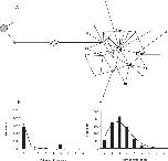 Figure 2. A network of ND2 haplotypes for Xenopus gilli populations.(A) Median-joining network diagrams of the number and structure of X. gilli haplotypes in the Cape peninsula and eastern populations based on ND2. Cape peninsula animals are indicated in grey, Pearly Beach indicated in white and Kleinmond in black. Circles are proportional to the number of individuals sequenced belonging to each haplotype and lines represent the number of nucleotide base pair changes from one to the other. Note that the 74 base pair changes between the two haplotype groups are represented by a broken line. The arrow points at a haplotype not included in the analysis but found on the Cape peninsula. (B) Pairwise difference and frequency for ND2 haplotypes for Xenopus gilli from the Cape peninsula, and (C) Pearly Beach and Kleinmond.