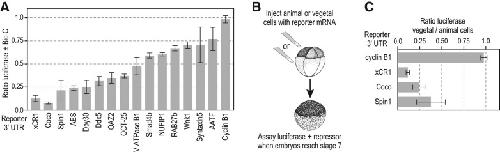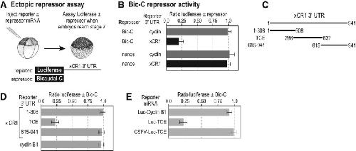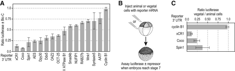 FIGURE 4. Identification of Bicaudal-C-regulated mRNAs. (A) Reporter mRNAs created with the 3′ UTRs of 14 different Bic-C-associated mRNAs identified by RIP-seq were assayed as described in Figure 1A. Reporter mRNAs containing the xCR1 TCE and the cyclin B1 3′ UTR serve as positive and negative controls, respectively. (B,C) Diagram of vegetal cell-specific repression assay (Zhang et al. 2009). Reporter mRNAs are injected into animal cells or vegetal cells of separate eight-cell embryos. When embryos reach stage 7, luciferase activity is assayed and the ratio in vegetal cells vs. animal cells calculated.