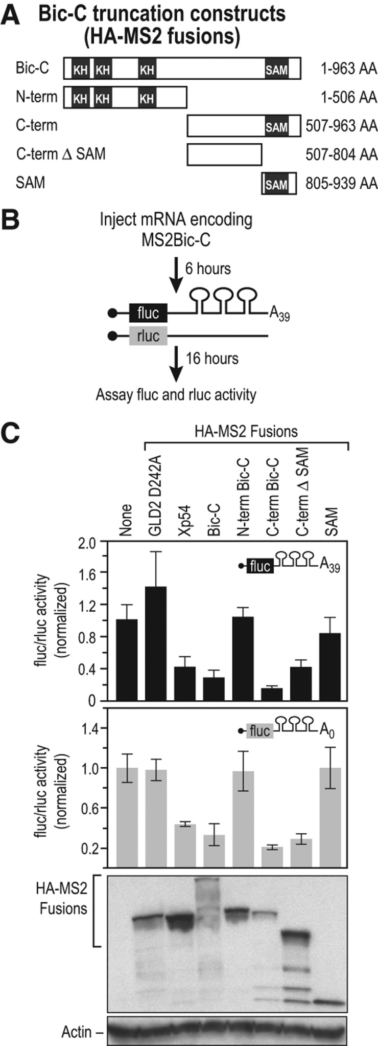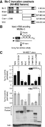 FIGURE 2. The C-terminal region of Bic-C contains translational repression activity. (A) The regions of Bic-C fused to MS2. (B) Diagram of the tethered translation assay (Coller et al. 1998; Coller and Wickens 2002, 2007). mRNAs encoding different Bic-C MS2 fusions were injected into oocytes, followed by injection of two reporter mRNAs; the 3′ UTR of the firefly luciferase reporter mRNA contained three MS2-binding sites and a 39-nt poly(A) tail; the Renilla luciferase reporter mRNA lacked MS2 sites. (C) The C-terminal half of Bic-C repressed translation independent of poly(A). Top panel: relative repression of firefly luciferase poly A39 mRNA translation by each protein. Middle panel: translational repression of firefly luciferase mRNA lacking a poly(A) tail by each protein. Bottom panel: analysis of fusion protein expression by immunoblotting with α–HA and α–actin antibodies.