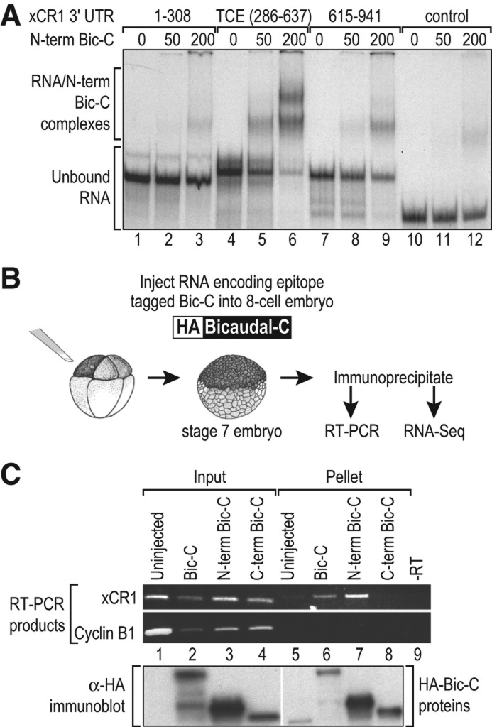 FIGURE 3. The N-terminal region of Bic-C specifically binds the TCE region of the xCR1 3′ UTR that directs translational repression. (A) Radiolabeled RNAs were mixed with 0, 50, and 200 nM GST-N-term Bic-C protein, and binding was analyzed by native gel electrophoresis. The 1–308, TCE (286–637), and 615–941 radiolabeled RNAs were derived from the xCR1 3′ UTR (see Fig. 2). The negative control RNA was derived from the pSTBlue plasmid. (B) Xenopus embryos injected with mRNAs encoding HA-tagged versions of Bic-C, the N-terminal half of Bic-C, or the C-terminal half of Bic-C. The Bic-C proteins were immunoprecipitated from blastula stage injected embryos with αHA antibodies, and the mRNAs present were analyzed using RT-PCR and RNA-seq. (C) The presence of the xCR1 and cyclinB1 mRNAs in the input and pellet fractions as assayed with RT-PCR. The input samples were unfractionated extract, and the pellet samples were the HA immunoprecipitates. Proteins from the input and pellet samples were analyzed by immunoblotting and the HA antibody (lower panel). The low molecular weight species detected in the uninjected sample (lane 5) is a cross-reacting species with the HA antibody.