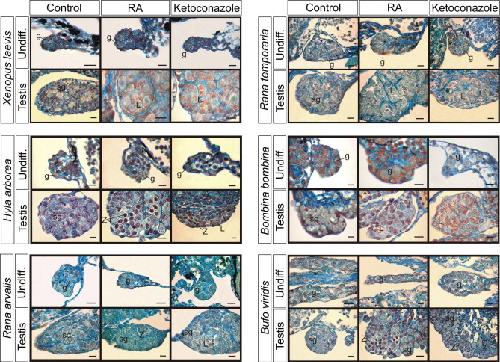 Fig. 3. Effects of RA and ketoconazole on the undifferentiated gonads and testes of anuran amphibians. In the control undifferentiated gonads (Undiff.) as well as in the undifferentiated gonads and testes after 20-days culture with RA or ketoconazole, only gonial cells (g) were present and no meiocytes were observed. In the control testes only spermatogonia (sg) were present. In the testes after 20-days treatment with RA or ketoconazole meiocytes at phases leptotene (L) or zygotene/pachytene (Z) appeared besides spermatogonia. Scale bar 25 μm.