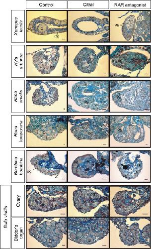 Fig. 4. Effects of citral and RAR antagonist (BMS453) on the ovaries of anuran amphibians including Bidderâs organs in Bufo viridis. In the control ovaries oogonia (og) as well as meiocytes at phases of leptotene (L), zygotene/pachytene (Z) as well as diplotene oocytes (D) were present. In the ovaries after 20-days culture with citral or RAR antagonist, only oogonia (og) were present and no meiocytes were visible. The control Bidderâs organs were filled with numerous diplotene oocytes (D), however, in the Bidderâs organs after 20-days treatment with citral or RAR antagonist the number of diplotene oocytes were lowered or only leptotene and zygotene/pachytene oocytes were present. Scale bar 25 μm.