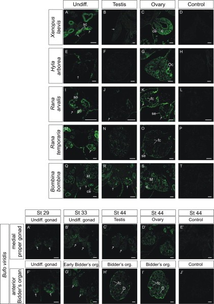 Fig. 5. The immunolocalization of Raldh2 in the developing gonads of anuran amphibians. (A) The undifferentiated gonad (arrows) and adjacent tissues of X. laevis. The strongest signal of Raldh2 was visible in the somatic cells of the gonads (sc). (B) A slight signal of the Raldh2 in the testis of X. laevis. (C) A significant expression of Raldh2 in the X. laevis ovary, especially in the cortex (c) but also in the coelomic epithelium (ce). (D) The control gonad of X. laevis. (E) The undifferentiated gonads and adjacent tissues of H. arborea. The signal was visible in the proximal region of the gonad and in the coelomic epithelium. (F) The testis of H. arborea â the signal of Raldh2 was almost absent. (G) The larval H. arborea ovary and a strong signal of Raldh2. Oocytes were present in the cortex (Oc). (H) The control gonad of H. arborea. (I) The undifferentiated gonad of R. arvalis. Raldh2 was visible in both germ (gc) and the somatic cells (sc). (J) The R. arvalis testis â Raldh2 signal was weak. (K) The ovaries of R. arvalis â a strong signal of Raldh2 was observed in the superficialepithelium (se) as well as in the flattened follicular cells (fc) enclosing the germ cells. (L) The control gonad of R. arvalis. (M) The undifferentiated gonads of R. temporaria â Raldh2 was seen in the somatic and germ cells. (N) The testis of R. temporaria â a slight signal of Raldh2 was visible. (O) The R. temporaria ovary â Raldh2 was visible in the superficialepithelium and the follicular cells enclosing the germ cells. (P) The control gonad of R. temporaria. (Q) The undifferentiated gonads of B. bombina. The signal of Raldh2 was visible in the gonads (arrows), coelomic epithelium (ce) and kidney tubules (kt). (R) The testes and adjacent tissues of B. bombina. (S) The ovaries and adjacent tissues of B. bombina. The strong signal of Raldh2 was visible in the cortex (c) whereas was absent in the gonadal medulla (M). (T) The control gonads of B. bombina. (Aâ²) A neglible signal of Raldh2 was present in the medial part of the genital ridge (arrows) of B. viridis at Gosner stage 29 â low level of the protein. (Bâ²) The undifferentiated gonads of B. viridis in the medial part at Gosner stage 33 â low level of Raldh2. (Câ²) The testis of B. viridis at Gosner stage 44 â low level of Raldh2. (Dâ²) The ovaries of B. viridis at Gosner stage 44 â an increase of Raldh2 signal. (Eâ²) The control ovaries of B. viridis at Gosner stage 44. (Fâ²) The anterior part of the genital ridge (future Bidderâs organ) of B. viridis, filled with oogonia at Gosner stage 29 â higher level of Raldh2 than in the medial part. (Gâ²) The early Bidderâs organ of B. viridis just prior to the meiosis entry at Gosner stage 33 â higher level of Raldh2 than in the medial part. (Hâ²) The Bidderâs organ of the B. viridis male at Gosner stage 44 containing many diplotene oocytes (D) â high signal of Raldh2 in the follicular cells (fc). (Iâ²) The Bidderâs organ of the B. viridis female at Gosner stage 44. (Jâ²) The control Bidderâs organ of B. viridis. Scale bar 40 μm.