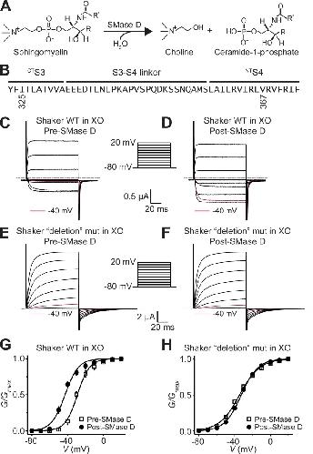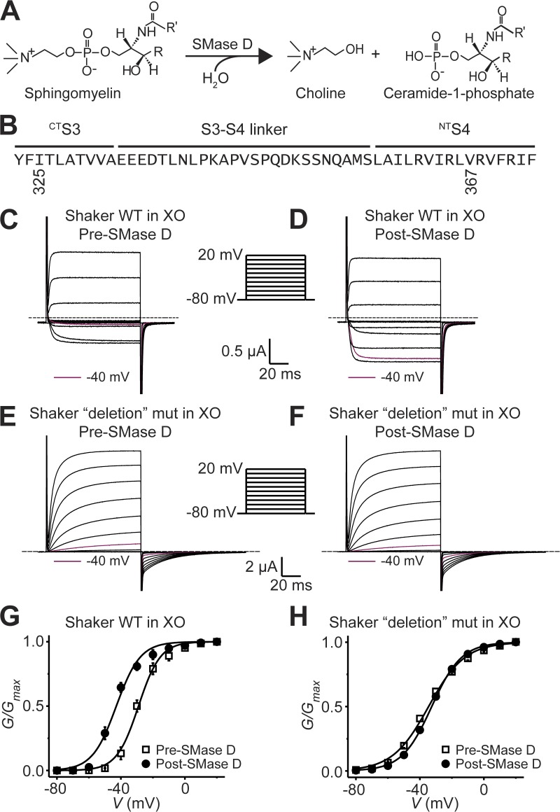 Figure 1. The extracellular portion of Shaker’s paddle motif is required for SMase D sensitivity. (A) Hydrolysis scheme of sphingomyelin by SMase D. (B) Amino acid sequence of Shaker’s paddle motif. Residues from I325 through V367 were replaced with a glycine triplet in the “deletion” mutant (mut) in E, F, and H. (C–F) Wild-type currents in 100 mM of extracellular K+ ([K+]ext; C and D) and “deletion” mut currents in 20 mM [K]ext (E and F) elicited by stepping membrane voltage of Xenopus oocytes (XO) from the −80-mV holding voltage to between −80 and 20 mV in 10-mV increments at 3-s intervals before (“pre”; C and E) and after (“post”; D and F) SMase D treatment, where for comparison, the current traces at −40 mV are colored maroon. Dashed lines indicate zero current levels. (G and H) G-V curves before (open squares) and after (closed circles) SMase D treatment for wild-type (G) and “deletion” mut (H), where all data are presented as means ± SEM (n = 5). The curves are fits of Boltzmann functions, yielding the midpoint (V1/2) of −29.0 ± 0.6 mV and the apparent valence (Z) of 3.8 ± 0.3 (open squares) or V1/2 = −42.9 ± 0.9 mV and Z = 3.4 ± 0.3 (closed circles) for G, and V1/2 = −34.6 ± 0.5 mV and Z = 2.3 ± 0.1 (open squares) or V1/2 = −32.6 ± 0.2 mV and Z = 2.7 ± 0.1 (closed circles) for H.