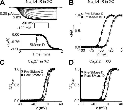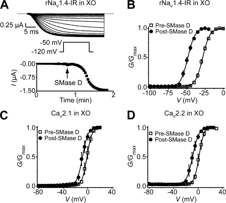 Figure 4. SMase D shifts the G-V curves of NaV and CaV channels expressed in Xenopus oocytes in the hyperpolarized direction. (A) NaV1.4-IR currents elicited by stepping the voltage every 4 s from the −100-mV holding potential to a −120-mV prepulse, and then to the −50-mV test potential; the dashed line indicates the zero current level. After the addition of recombinant SMase D to the bathing solution, the current gradually increased (top). Time course of NaV1.4-IR current increase after the addition of SMase D (bottom). (B–D) G-V curves before (squares) and after (circles) treatment with SMase D for NaV1.4-IR (B), CaV2.1 (C), and CaV2.2 (D), where all data are presented as means ± SEM (n = 3–9). The curves are fits of Boltzmann functions, yielding the midpoint (V1/2) of −28.2 ± 0.4 mV and the apparent valence (Z) of 5.2 ± 0.1 (open squares), or V1/2 = −48.5 ± 0.2 mV and Z = 5.2 ± 0.2 (closed circles) for B; V1/2 = −1.0 ± 0.1 mV and Z = 6.3 ± 0.2 (open squares), or V1/2 = −8.4 ± 0.2 mV and Z = 5.6 ± 0.3 (closed circles) for C; V1/2 = 1.5 ± 0.1 mV and Z = 6.6 ± 0.2 (open squares), or V1/2 = −8.9 ± 0.2 mV and Z = 5.1 ± 0.2 (closed circles) for D.