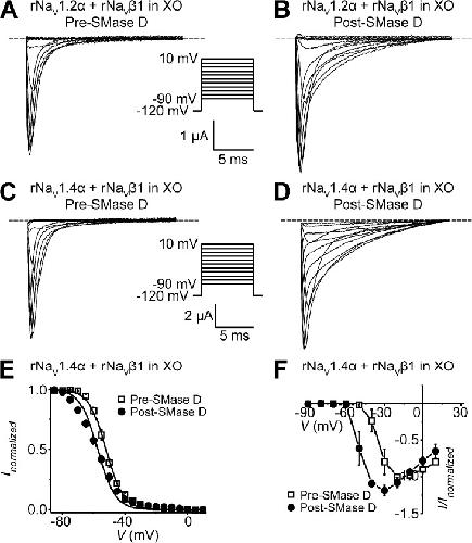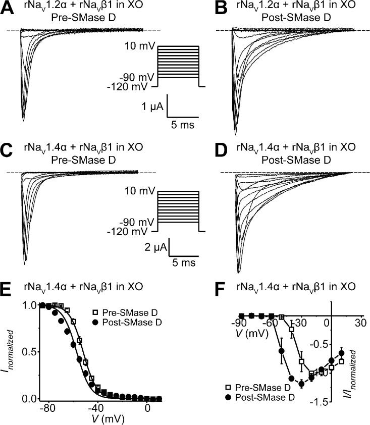 Figure 5. SMase D stimulates NaVα + β1 channels in oocytes and slows their inactivation. (A–D) rNav1.2α + β1 (A and B) or rNav1.4α + β1 (C and D) currents from an oocyte, before (A and C) and after (B and D) SMase D treatment, by stepping the membrane voltage from the −120-mV holding voltage to various test potentials between −90 and 10 mV. (E and F) Steady-state inactivation curves (E) and I-V relations (F) before (open squares) and after (closed circles) SMase D treatment; all data are presented as means ± SEM (n = 3–6). Curves in E are fits to single Boltzmann functions, yielding V1/2 = −52.0 ± 0.2 mV and Z = 4.7 ± 0.2 (open squares), and V1/2 = −56.1 ± 0.8 mV and Z = 3.6 ± 0.2 (closed circles).