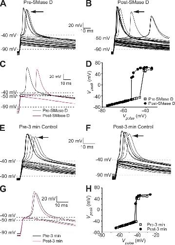 Figure 9. SMase D shifts the action potential threshold of N2A cells in the hyperpolarized direction. (A–C) Passive voltage responses and action potentials of an N2A cell elicited by several series of 2-ms current pulses between ∼200 and 500 pA in 30-pA increments before (A) and after (B) 3-min SMase D treatment. The action potentials indicated by arrows and the most depolarized passive voltage responses are replotted as black (A) and maroon (B) curves in C. (D) Peak voltages (A, open squares, and B, closed circles) plotted against the instantaneous voltage at the end of the 2-ms current pulse. (E–G) Passive voltage responses and action potentials of an N2A cell elicited by several series of 2-ms current pulses between ∼200 and 500 pA in 30-pA increments before (E) and after (F) 3-min control in the absence of SMase D treatment. The action potentials indicated by arrows and the most depolarized passive voltage responses are replotted as black (E) and maroon (F) curves in G. (H) Peak voltages (E, open squares, and F, closed circles) plotted against the instantaneous voltage at the end of the 2-ms current pulse.