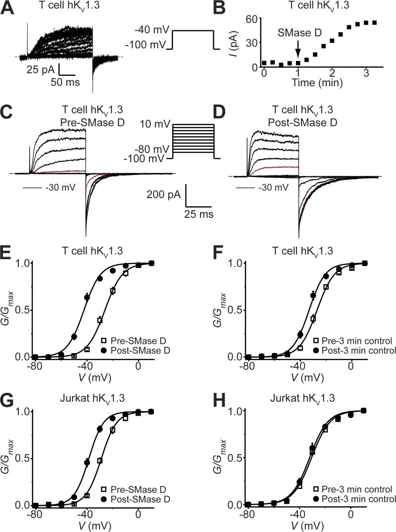 Figure 3. SMase D activates native KV1.3 channels in human T cells. (A) KV1.3 currents of a T cell recorded in the presence of 5 mM [K+]ext elicited by stepping the voltage every 15 s from the −100-mV holding potential to the −40-mV test potential. After the addition of SMase D, the current gradually increased. (B) Time course of KV1.3 current increase after the addition of SMase D. (C and D) KV1.3 currents ([K+]ext = 20 mM) elicited by stepping the membrane voltage from the −100-mV holding potential to between −80 and 10 mV in 10-mV increments at 15-s intervals before (C) and after (D) the addition of SMase D to the bath solution, where the current traces for −30 mV are colored maroon. Dashed lines in A, C, and D indicate zero current levels. (E–H) G-V curves of KV1.3 channels in T cells (E and F) and Jurkat cells (G and H) before (open squares) and after (closed circles) either a 3-min treatment with SMase D (E and G) or a 3-min control period in the absence of SMase D (F and H), where all data are presented as means ± SEM (n = 5). The curves are fits of Boltzmann functions, yielding V1/2 = −26.1 ± 0.4 mV and Z = 3.7 ± 0.2 (open squares), or V1/2 = −42.4 ± 0.6 mV and Z = 4.0 ± 0.3 (closed circles) for E; V1/2 = −27.0 ± 0.4 mV and Z = 3.8 ± 0.2 (open squares) or V1/2 = −33.2 ± 0.5 mV and Z = 4.1 ± 0.3 (closed circles) for F; V1/2 = −28.8 ± 0.4 mV and Z = 4.3 ± 0.2 (open squares) or V1/2 = −38.6 ± 0.3 mV and Z = 4.5 ± 0.2 (closed circles) for G; and V1/2 = −30.6 ± 0.5 mV and Z = 3.5 ± 0.2 (open squares) or V1/2 = −32.1 ± 0.5 mV and Z = 3.6 ± 0.2 (closed circles) for H.