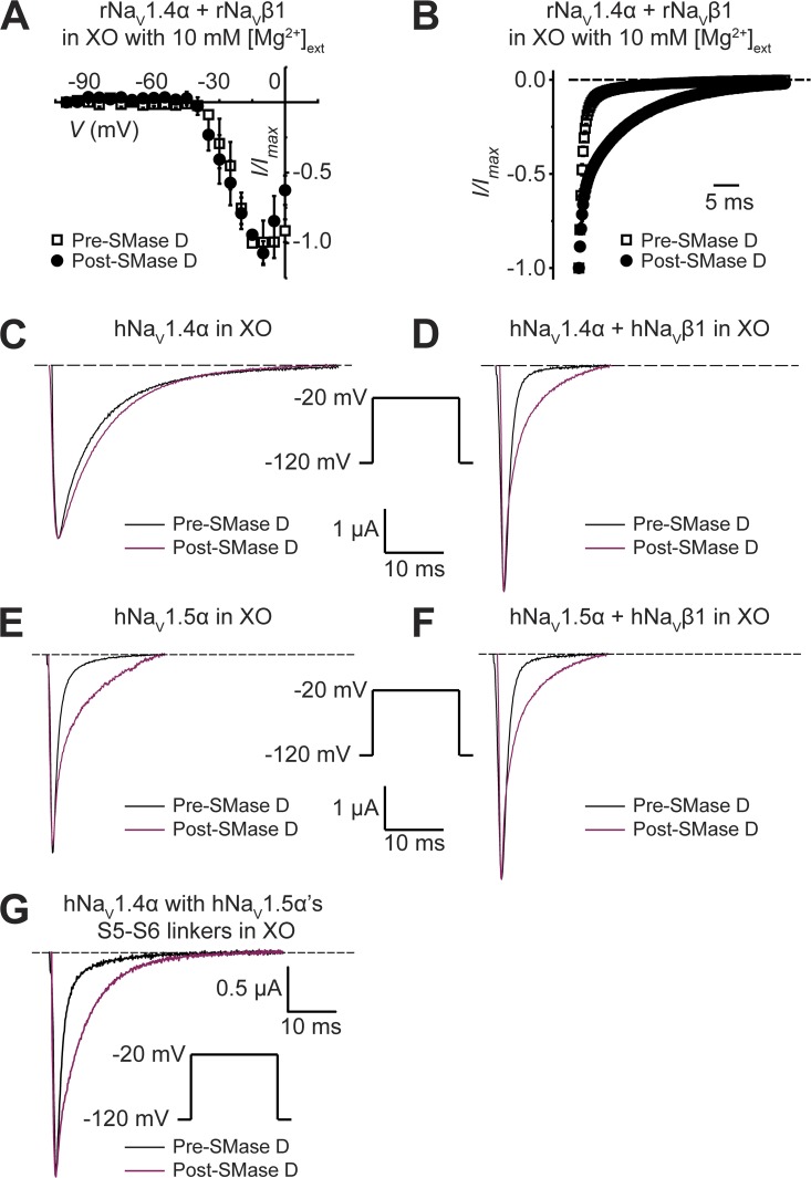 Figure 6. Effects of high Mg2+ and the NaVβ1 subunit on SMase D sensitivity of NaV channels. (A and B) rNaV1.4α + β1’s I-V curves (A) and inactivation time courses at −20 mV (B), collected in the presence of 10 mM of extracellular Mg2+ without (open squares) or with (closed circles) SMase D; all data are presented as means ± SEM (n = 3). (C–G) Currents of hNaV1.4α (C), hNaV1.4α + β1 (D), hNaV1.5α (E), hNaV1.5α + β1 (F), and mutant hNaV1.4α containing hNaV1.5α’s S5–S6 linkers (G), elicited by depolarizing the membrane from −120 to −20 mV before (black) and after (maroon) SMase D treatment. Dashed lines indicate the zero current level.