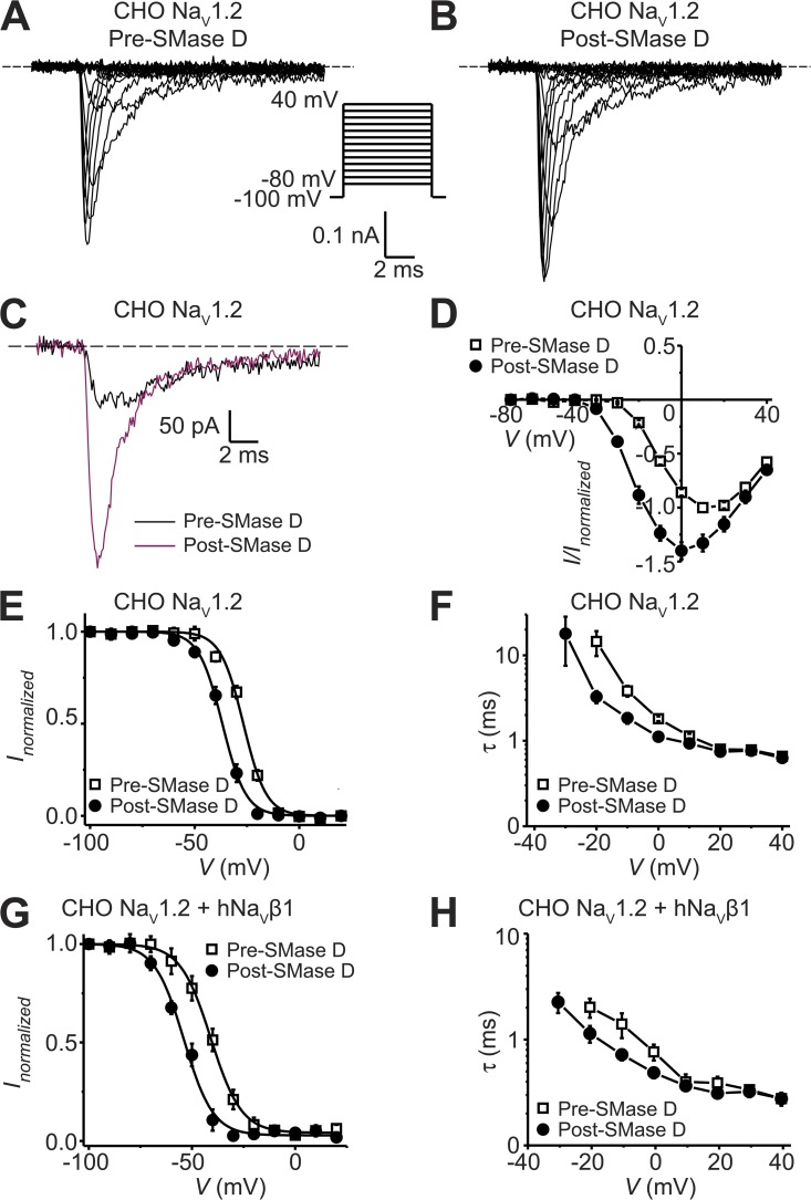 Figure 7. Effect of SMase D on native NaV channels in CHO cells. (A–C) NaV currents from a CHO cell before (A) and after (B) the addition of SMase D, elicited by stepping the membrane voltage from the −100-mV holding voltage to various test potentials between −80 and 40 mV in 10-mV increments. The current traces at −20 mV from A (black) and B (maroon) are superimposed in C. Dashed lines indicate zero current levels. (D) I-V relations before (open squares) and after (closed circles) SMase D treatment; all data are presented as means ± SEM (n = 5). (E–H) Steady-state inactivation curves (E and G) and voltage dependence of inactivation time constants (F and H) from cells expressing (G and H) or not expressing (E and F) hNaVβ1 before (open squares) and after (closed circles) SMase D treatment; all data are presented as means ± SEM (n = 5). Curves are fits to single Boltzmann functions, yielding V1/2 = −26.8 ± 0.4 mV and Z = 4.7 ± 0.3 (open squares), and V1/2 = −36.8 ± 0.3 mV and Z = 4.6 ± 0.2 (closed circles) in E; and V1/2 = −40.9 ± 0.4 mV and Z = 3.5 ± 0.2 (open squares), and V1/2 = −53.9 ± 0.7 mV and Z = 3.6 ± 0.3 (closed circles) in G.