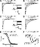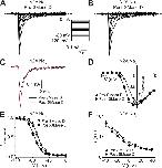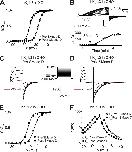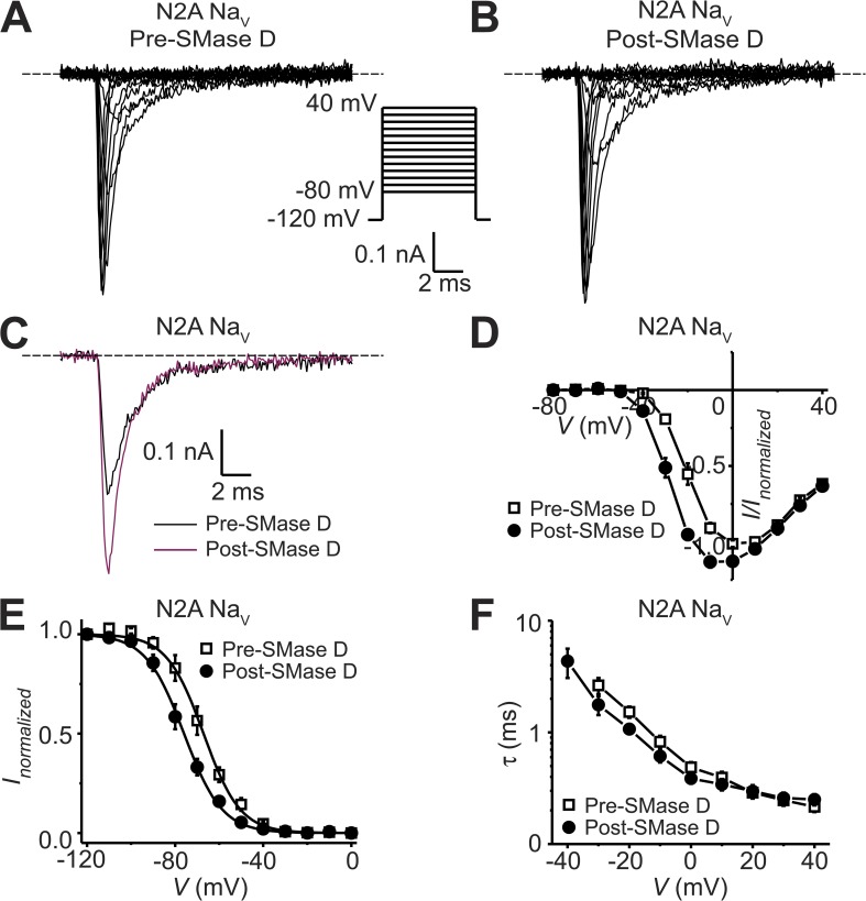 Figure 8. SMase D stimulates native NaV channels in N2A cells. (A–C) NaV currents from an N2A cell before (A) and after (B) the addition of SMase D, elicited by stepping the membrane voltage from the −100-mV holding voltage to a −120-mV prepulse and then to various test potentials between −80 and 40 mV in 10-mV increments. The current traces at −20 mV from A (black) and B (maroon) are superimposed in C. Dashed lines indicate zero current levels. (D–F) I-V relations (D), steady-state inactivation curves (E), and voltage dependence of inactivation time constants (F) before (open squares) and after (closed circles) SMase D treatment; all data are presented as means ± SEM (n = 5). Curves in E are fits to single Boltzmann functions, yielding V1/2 = −67.2 ± 0.4 mV and Z = 3.1 ± 0.1 (open squares), and V1/2 = −76.0 ± 0.3 mV and Z = 3.0 ± 0.1 (closed circles).