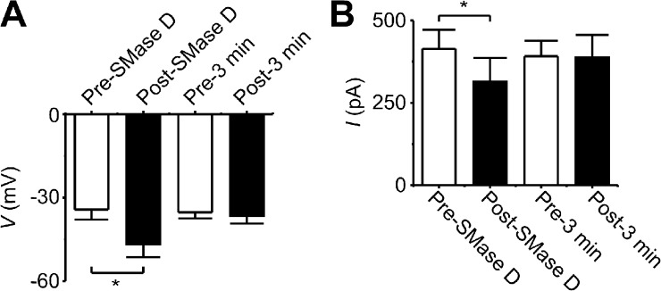 Figure 10. SMase D causes a negative shift in the action potential threshold and reduces the amount of injected current required to depolarize the membrane potential to the action potential threshold. (A) Averaged action potential threshold voltage (means ± SEM; n = 5) before (white) and after (black) SMase D treatment (P < 0.01) or before (white) and after (black) 3-min control without SMase D treatment. (B) Average injected current required to depolarize the membrane potential to the threshold (means ± SEM; n = 5) before (white) and after (black) SMase D treatment (P < 0.01) or before (white) and after (black) 3-min control without SMase D treatment. The p-values were calculated with a paired-sample, two-tailed t test method.