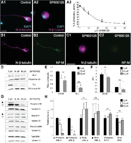 Figure 1. JNK inhibition compromises axon outgrowth and cytoskeletal protein expression. A1, A2, Representative images of neurons in control or SP600125-treated (50 μM) dissociated embryonic neural tube–myotome cultures, as indicated. Immunostaining for N-β-tubulin (magenta) labeled cell bodies and axons (if present), and DAPI (blue) labeled nuclei. A3, Quantification (30 neurons/culture, n = 6 cultures) of the percentage (±SEM) of N-β-tubulin+ cells that had axons in increasing concentrations of SP600125 indicated that JNK activity was required for axon initiation, reaching statistical significance at 5 μM SP600125 (p < 0.01, two-sided t-tests with control, 30 neurons/culture, n = 5 cultures). B, C, Double-label immunocytochemistry for N-β-tubulin (B1, C1, magenta) and NF-M (B2, C2, green), with or without 50 μM SP600125 (C1,C2 and B1,B2, respectively), showed a decrease in the level of NF-M expression when JNK was inhibited. Scale bars, 20 μm. D, Representative Western blots of cultures grown in 0, 10, or 50 μM SP600125. E, Intensities of NF-M and tau protein bands, after normalization against ribosomal protein S6 (loading control), were plotted relative to the intensity at 0 μM SP600125 (±SEM). JNK inhibition (10 and 50 μM) significantly reduced NF-M and tau levels compared with the 0 μM control (ns, nonsignificant; *p < 0.05 and p < 0.01 for NF-M and tau, respectively, one-way ANOVA with Tukey's post hoc test, n = 3 replicates of 25 pooled cultures for each condition); there was no significant difference in this effect between 10 and 50 μM SP600125 (p = 0.6, one-way ANOVA). F, qRT-PCR for NF-M and tau (ΔCT ± SD, relative to GAPDH) of cultures grown in 0, 10, or 50 μM SP600125 displayed no significant change in NF-M or tau RNA expression when JNK was inhibited (p = 0.5, one-way ANOVA, n = 3 replicates of 25 pooled cultures for each condition). G, H, Western blots of SP600125-treated cultures were probed with antibodies to activated (phospho-) JNK, total JNK, activated (phospho-) ERK, and total ERK to investigate effects of SP600125 on the levels of activated and total JNK versus activated and total ERK. Intensities of activated and total JNK and ERK bands, after normalization against histone H3, were plotted relative to the intensity at 0 μM SP600125 (±SEM). White and black triangles indicate the p46 (α) and p54 (β) isoforms of JNK, which in X. laevis are 44 and 48 kDa, respectively. Levels of activated JNK-α and JNK-β were significantly reduced (p < 0.01, one-way ANOVA with Tukey's post hoc test, n = 3 replicates of 25 pooled cultures for each condition) with SP600125 treatment, whereas no significant effects were observed for total JNK-α/β, activated ERK, and total ERK (p = 0.7, p = 0.9, p = 0.4, p = 0.3, respectively, one-way ANOVA), indicating that SP600125 specifically inhibited JNK activation. |