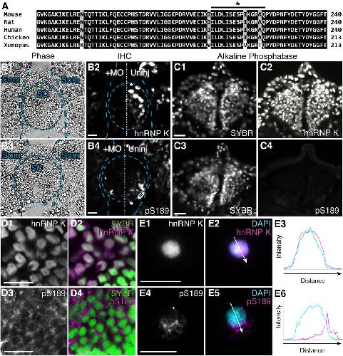 Figure 2. Serine 189, the JNK target site on Xenopus hnRNP K, is phosphorylated in neurons in vivo. A, Multiple sequence alignment of the region of hnRNP K surrounding X. laevis hnRNP K S189 (indicated by *) from five species shows that the prospective JNK site is highly conserved. Black and gray shading indicates 100 and 80% conservation among the different species examined, respectively. The black line indicates the region of Xenopus hnRNP K used to generate the phospho-specific antibody (pS189). B, C, Immunohistochemistry (IHC) on transverse sections of spinal cord and somites of stage 37/38 embryos. B, Sections of embryos unilaterally injected with hnRNP K MO at the two-cell stage. Overlays indicate locations of spinal cord (SC) and somites (Som). Unilateral MO suppression of endogenous hnRNP K caused a similar reduction of immunostaining (p = 0.9, two-sided t test, 5 sections per embryo, n = 3 embryos per condition) for both total hnRNP K (55 ± 1% injected/uninjected, p = 0.03, one-sided t test as before; B2) and pS189 (56 ± 5% injected/uninjected, p = 0.01, one-sided t test as before; B4) on the injected side, indicating that pS189 is specific for hnRNP K. Phase contrast images (B1, B3) demonstrated that loss of staining in spinal cord and somites was attributable to loss of expression on the injected side and not to loss of cells. C, Sections of uninjected embryos treated with alkaline phosphatase before immunostaining for total hnRNP K (C2) or pS189 (C4), demonstrating specificity of pS189 for phosphorylated hnRNP K. C1, C3, SYBR Green staining of nuclei demonstrated that loss of staining was not attributable to cell loss. D, E, Representative images of immunostaining (magenta) of stage 37/38 hindbrain sections (D; confocal microscopy) and neurons from dissociated neural tube/myotome cultures (E; conventional microscopy) with the pS189 antibody indicated hnRNP K was phosphorylated at S189 in vivo during nervous system development. Whereas total hnRNP K shuttles to the cytoplasm but localized predominantly to the nucleus during axon outgrowth (D1, D2, SYBR Green; E1âE3, DAPI, blue), phospho-hnRNP K (pS189) was primarily cytoplasmic and perinuclear (D3, D4, E4âE6). Arrows indicate regions measured for intensity profiles (E3, E6). Scale bars, 20 μm. |