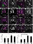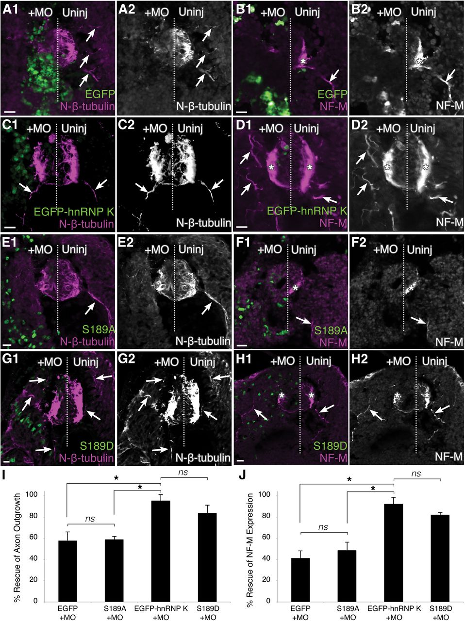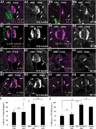 Figure 4. Phosphorylation of the JNK site (S189) is essential for the function of hnRNP K in axon outgrowth. Transverse sections of spinal cord through stage 37/38 embryos. Immunostaining (magenta) for N-β-tubulin (A, C, E, G) and NF-M (B, D, F, H) was used to assay rescue of hnRNP K MO phenotype. The midline is represented by a dotted line, and the injected side (+MO) was unilaterally injected at the two-cell stage with hnRNP K MO and mRNA encoding the fluorescent fusion protein indicated (green). A, B, EGFP by itself rescued neither the axonless phenotype (A1, A2) nor the loss of NF-M expression (B1, B2) caused by hnRNP K MO knockdown. NF-M was expressed (*), and motor axons (arrows) were readily visible extending from the spinal cord into somites on the uninjected side, neither of which could be seen on the injected side. C, D, Unilateral coinjection of EGFP–hnRNP K with the hnRNP K MO yielded axons and NF-M expression on both the injected and uninjected sides, indicating the unmutated hnRNP K fusion protein was fully functional in the intact organism. E, F, A serine-to-alanine mutation of the JNK site on hnRNP K (S189A) abrogated the function of hnRNP K in both axon outgrowth and NF-M expression. G, H, A serine-to-aspartic acid mutation (S189D) successfully rescued both axon outgrowth (arrows) and NF-M expression (*). Scale bars, 20 μm. I, J, Reproducibility of phenotypes was assessed using quantitative immunofluorescence to determine rescue of axon outgrowth (I; N-β-tubulin staining in somites) and translation of an mRNA target of hnRNP K (J; NF-M staining in spinal cord). Degrees of rescue and p values are described fully in Results. ns, Nonsignificant; *p < 0.05, one-way ANOVA with Tukey's post hoc test; 5 sections per embryo, n = 3 embryos per condition. |