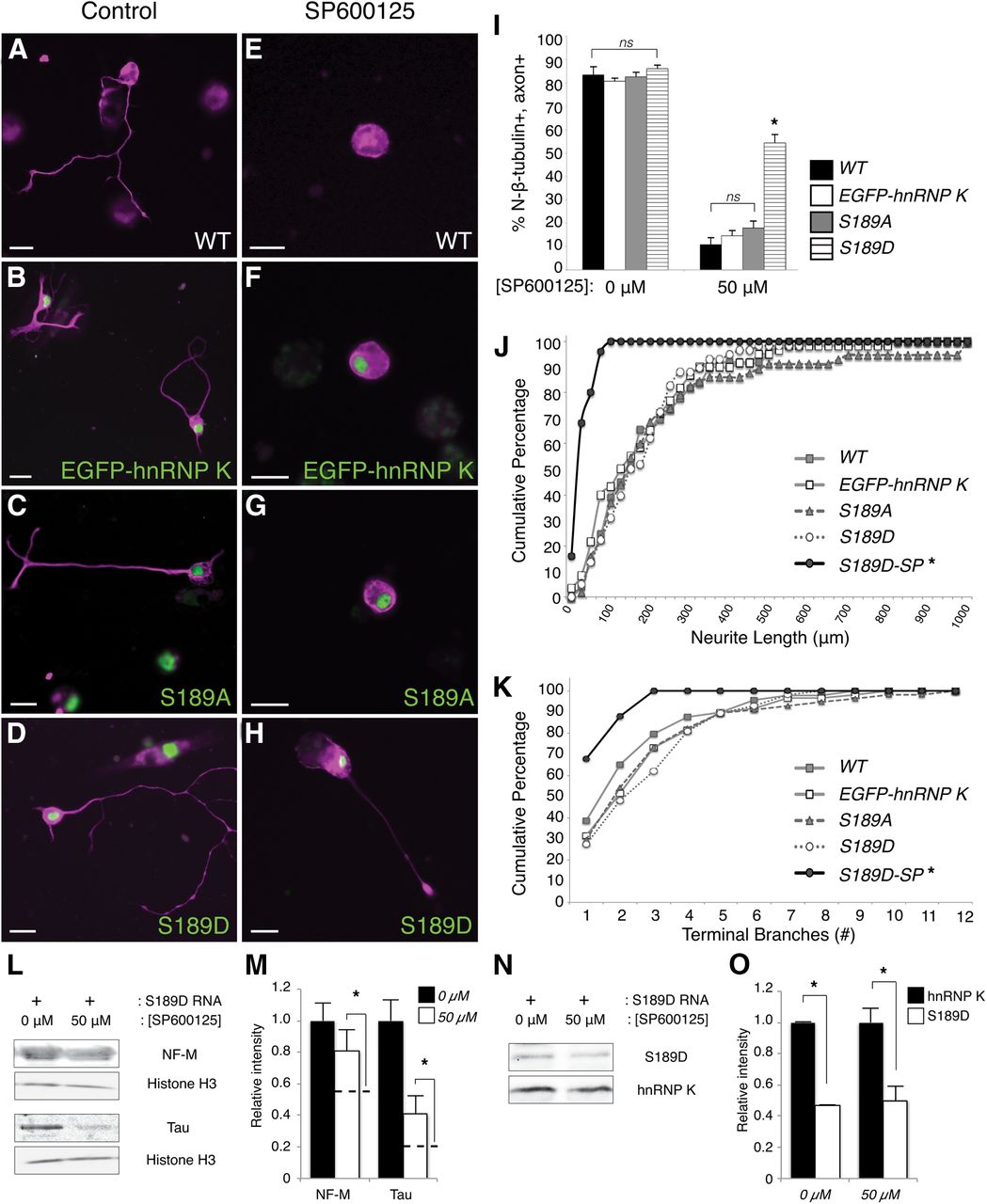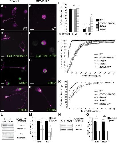 Figure 5. Phosphomimetic mutation of the JNK site on hnRNP K is sufficient to overcome JNK inhibition to restore axon outgrowth. AâH, Immunostaining for N-β-tubulin (magenta) visualized neuronal cell bodies and axons (if present) in representative images of control (AâD) or SP600125-treated (EâH) primary cultures. Expression of mRNA encoding EGFPâhnRNP K, S189A, and S189D is indicated by green fluorescence. Neurons isolated from uninjected WT (A, E), EGFPâhnRNP K mRNA-injected (B, F), and S189A RNA-injected (C, G) embryos successfully formed axons in the absence of pharmacological inhibition of JNK by SP600125 (AâC); the formation of axons by these neurons was severely compromised when grown in 50 μM SP600125 (EâG). However, neurons cultured from S189D mRNA-injected embryos formed axons both with and without SP600125 (D, H). Scale bars, 20 μm. I, Quantification (>30 neurons/culture, n = 5 cultures) of the percentage of N-β-tubulin+ cells that had axons in the RNA-injected cultures with SP600125 indicated that only neurons expressing the phosphomimetic mutation of the JNK site (S189D) on hnRNP K were able to rescue axon outgrowth significantly. Error bars indicate SEM. ns, Nonsignificant; *p < 0.01, one-way ANOVA with Tukey's post hoc test. J, K, Neurite lengths and terminal branch numbers were plotted as cumulative frequencies (percentages) for S189D-expressing neurons cultured in 50 μM SP600125 (S189D-SP), as well as for untreated WT, EGFPâhnRNP K-, S189A-, and S189D-expressing neurons, as indicated. Both total neurite length/neuron and terminal branch number differed significantly between S189D-SP and S189D neurons (*p < 0.001, p = 0.003, respectively, KolmogorovâSmirnov goodness of fit test, n = 3 cultures, >25 neurons/culture), whereas they did not for untreated EGFPâhnRNP K-, S189A-, and S189D-expressing neurons compared with untreated WT (p = 0.3, p = 0.7, p = 0.4, respectively, for length; p = 0.4, p = 0.5, p = 0.2, respectively, for branching). L, M, The ability of S189D to rescue expression of tau and NF-M protein from JNK inhibition (50 μM SP600125) in culture, assayed by Western blot. L, Representative examples, with histone H3 used as a loading control. M, Average ± SEM intensities of the indicated bands (normalized to histone H3) relative to 0 μM SP600125 (n = 3 replicates of 25 pooled cultures for each condition). To show the degree of rescue, dotted lines indicate the equivalent data for WT neurons in 50 μM SP600125, which were originally presented in Figure 1. Expression of S189D significantly (although not entirely) rescued NF-M and tau protein expression from SP600125 treatment (p = 0.04, p = 0.02, respectively, one-sided t test against WT in 50 μM SP600125, n = 3 replicates of 25 pooled cultures for each condition). N, O, The level of S189D expression was compared with that of endogenous hnRNP K on the same Western blots with an hnRNP K antibody, using the same cultures as in L and M. For both control (0 μM) and SP600125-treated (50 μM) cultures, S189D was expressed at 47 ± 1 and 50 ± 9% of endogenous hnRNP K, respectively (p < 0.001, p = 0.03, respectively, one-sided t test). |