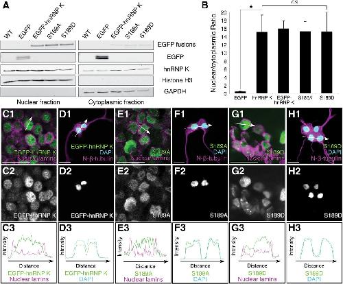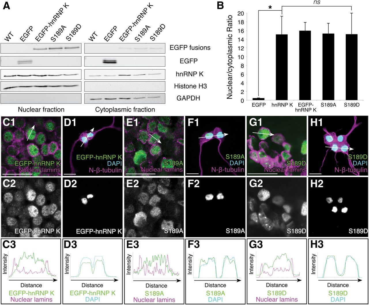 Figure 6. Mutation of the JNK site on hnRNP K has no effect on its subcellular localization. A, B, Nucleocytoplasmic fractionation followed by Western blot analysis of lysates from uninjected WT, EGFP mRNA-, EGFP–hnRNP K mRNA-, S189A mRNA-, and S189D mRNA-injected stage 37/38 embryos. A, Chemiluminescence immunoblot analysis with antibodies to histone H3 (nuclear) and GAPDH (cytoplasmic) indicated complete separation of the fractions. EGFP fusions (EGFP–hnRNP K, S189A, and S189D) and EGFP were all visualized with anti-GFP and compared with endogenous hnRNP K localization. B, Ratios of nuclear versus cytoplasmic band intensities, normalized to histone H3 and GAPDH, respectively, indicated that all EGFP fusions localized similarly to endogenous hnRNP K. Error bars indicate SEM, n = 3 replicates of 40 embryos per group. *p < 0.01, one-way ANOVA with Tukey's post hoc test; ns, nonsignificant (p > 0.9, as before). C–H, Fluorescence immunostaining (magenta) on stage 37/38 hindbrain sections (C, E, G) and primary neuronal cultures (D, F, H). An antibody to nuclear lamins (C, E, G) and DAPI (D, F, H, blue) labeled nuclei, and N-β-tubulin labeled neurons (D, F, H). Arrows (C1–H1) indicate regions measured for intensity profiles (C3–H3). Subcellular localization of EGFP–hnRNP K (C, D), S189A (E, F), and S189D (G, H) was similar to that of endogenous hnRNP K (shown previously in Fig. 3D,E). Scale bars, 20 μm. |