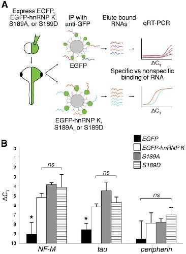 Figure 7. The endogenous association of EGFP–hnRNP K with targeted RNAs is unaffected by mutation of the JNK site. A, Experimental design of RNA-binding protein/RNA coimmunoprecipitation to test RNA association in vivo of EGFP fusion proteins (EGFP–hnRNP K, S189A, S189D). After expression of EGFP (control) and EGFP fusions, lysates were incubated with anti-GFP-coated beads to coimmunoprecipitate proteins with bound RNAs. In qRT-PCR, specifically bound RNAs reached threshold before RNAs that were nonspecific and therefore had smaller ΔCT values. B, Real-time qRT-PCR of RNAs eluted from anti-GFP immunoprecipitation, normalized to total input control. ΔCT values of NF-M and tau (hnRNP K targets) were significantly lower for EGFP–hnRNP K, S189A, and S189D compared with that of EGFP control (*p < 0.05, one-way ANOVA with Tukey's post hoc test) but not for peripherin (a nontarget), indicating specific binding. One-way ANOVA further showed no significant (ns) difference in binding of NF-M and tau among EGFP fusion proteins. Error bars indicate SD, n = 3 replicates, 30 embryos per group. |