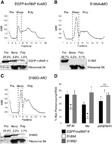 Figure 8. Phosphorylation of the JNK site on EGFP–hnRNP K regulates handoff of its RNA targets to the translational machinery. Polysome profiling followed by Western blot analysis of cytosolic extracts from embryos unilaterally coinjected with hnRNP K MO and either EGFP–hnRNP K (A), S189A (B), or S189D mRNA (C). The black line indicates RNA absorbance at 260 nm (A260) across fractions, and premonosomal (Pre), monosomal (Mono), and polysomal (Poly) fractions are indicated (top). Western blots were probed with anti-GFP to visualize the EGFP fusions and anti-S6 to demonstrate proper polysomal separation (bottom). A, EGFP–hnRNP K was most abundant in the premonosomal fractions (94.6%) but was also present to a lesser extent in the monosomal (3.9%) and polysomal fractions (1.5%). B, The loss of phosphorylation at the JNK site prevented S189A from moving beyond the premonosomal fraction (99.7%) into heavier, translating fractions (0.3%). C, S189D, like EGFP–hnRNP K (A), also appeared across all fractions (premonosome, 95.4%; monosome, 3.5%; polysome, 1.1%). D, Quantitation by real-time qRT-PCR of the target (NF-M and tau) and nontarget (peripherin) RNAs of hnRNP K among non-premonosomal fractions (monosome + polysome) with real-time qRT-PCR. Relative amounts (corrected against uninjected WT; see Results) of NF-M (*p = 0.04, one-way ANOVA with Tukey's post hoc test; 3 replicates, 25 embryos per sample) and tau (*p = 0.01, as before) mRNAs in these fractions for embryos unilaterally coinjected with hnRNP K MO and S189A RNA were significantly reduced compared with those coinjected with EGFP–hnRNP K or S189D RNA, whereas relative amounts of peripherin mRNA were not significantly different among groups (p = 0.2, one-way ANOVA as above). Error bars indicate pooled SDs. ns, Nonsignificant. |