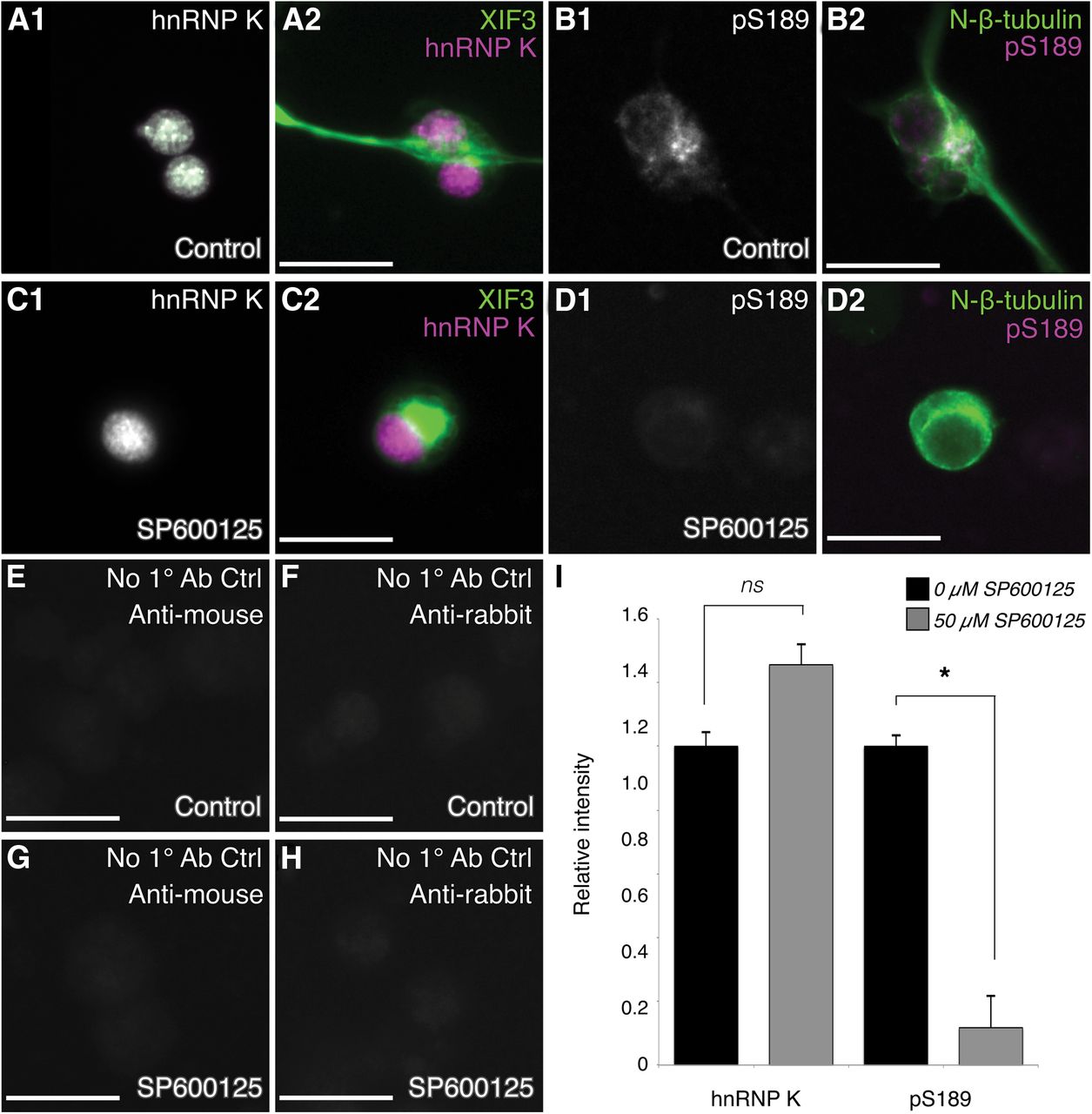 Figure 3. Phosphorylation at serine 189 on Xenopus hnRNP K is reduced by pharmacological inhibition of JNK. A–D, Representative neurons from control or SP600125-treated cultures stained for total hnRNP K and peripherin (XIF3; A, C) or pS189 and N-β-tubulin (B, D). E–H, Background intensity measurements for control (E, F) or SP600125-treated (G, H) cultures were taken from cultures stained without primary antibodies (Ab) to total hnRNP K (E, G) or pS189 (F, H). JNK inhibition caused a significant decrease in staining for pS189 but not total hnRNP K (I). Scale bars, 20 μm. ns, Nonsignificant, p = 0.5; *p = 0.02, two-sided t test, 30 neurons/culture, n = 5 cultures. |