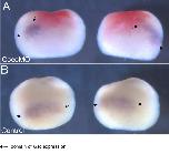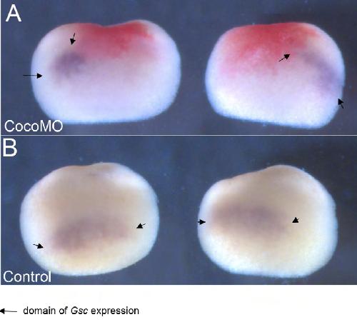 Suppl. Figure 2: Knockdown of Coco results in a loss of headmesoderm. (A) CocoMO injected embryo at st9.5. Purple staining represents Gsc and red staining, CocoMO. Gsc expression is lost where Coco is knocked down. (B) Uninjected control embryo showing endogenous Gsc expression