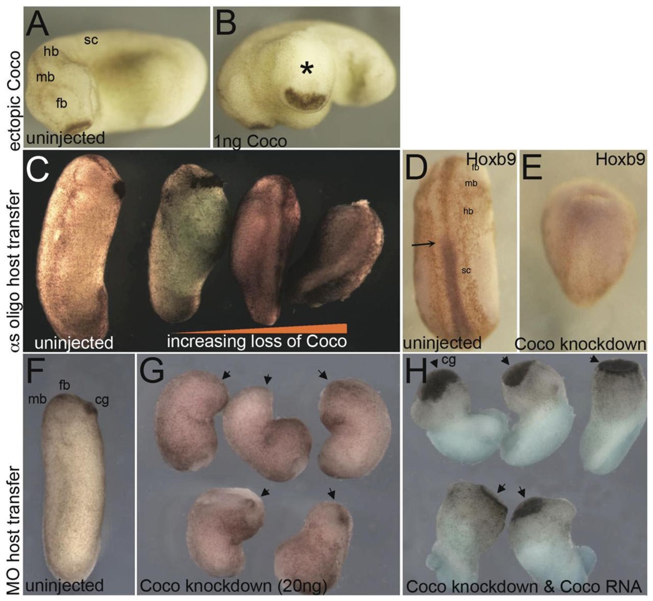 Fig. 1. Knockdown of Coco causes anterior truncations at tadpole stages. (A-H) Xenopus embryos at stage 28. Overexpression of Coco results in embryos with an ectopic head; compare uninjected embryo (A) with Coco-injected (B, asterisk). Knockdown of Coco causes anterior truncations (C). Hoxb9 is expressed in the spinal cord (D, arrow); Coco morphant embryos have no expression of Hoxb9 (E). Host transfers were also performed with MO (F-H). Embryos have a loss of anterior structures (G, arrowheads, compared with control embryo in F). Anterior structures, such as the cement gland (H, arrowheads) could be rescued by injection of Coco RNA. (A,B) Lateral view, anterior to the left. (C-H) Anterior to the top. cg, cement gland; fb, forebrain; hb, hindbrain; mb, midbrain; sc, spinal cord.