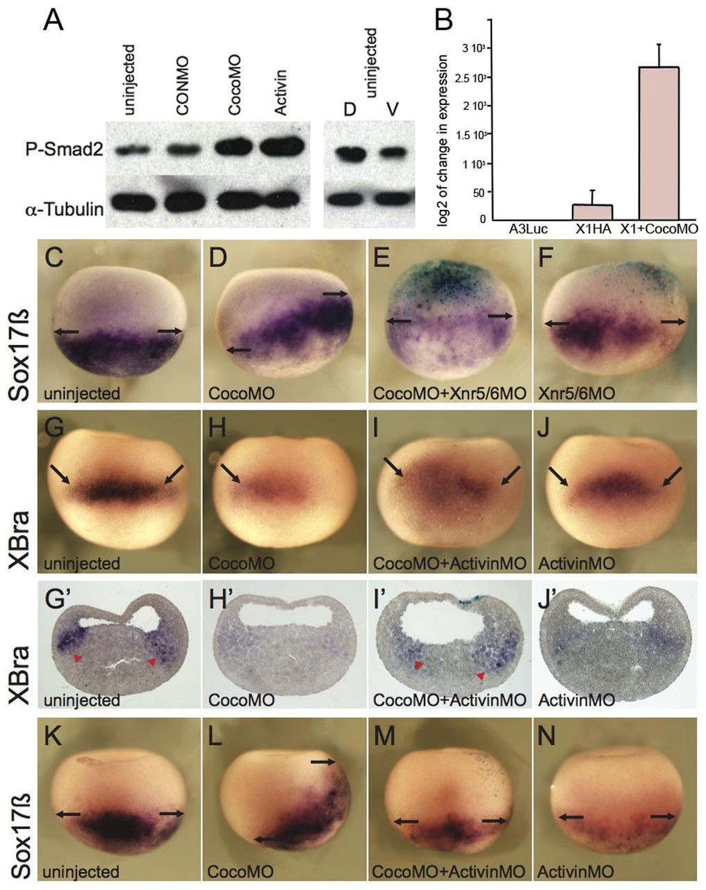 Fig. 3. Germ layer defects in Coco morphant embryos are caused by an increase in Xnr5/6 and Activin signalling. (A) Western blot analysis demonstrating an increase of P-Smad2 following CocoMO and Activin overexpression, compared with uninjected and ControlMO-injected embryos. A dorsoventral bias of P-Smad2 is detected in normal development (compare dorsal half with ventral half). (B) Coco depletion increases Nodal-induced transcription of a reporter gene. Error bars represent standard errors. Assays were performed in triplicate. (C-N) Embryos were injected with CocoMO, CocoMO+TGFβMO or TGFβMO and compared with uninjected control embryos at stage 9.5. (C-F) Injection of CocoMO causes a shift in Sox17β expression (D, arrows), which is rescued by co-injection with Xnr5/6MO (E). (F) Injection of Xnr5/6MO alone does not affect the Sox17β domain, but reduces the intensity of expression. (G-Jâ²) Injection of CocoMO causes a reduction in Xbra staining in the marginal zone (H,Hâ²), which is clearly rescued by co-injection with ActivinMO (I,Iâ²), an effect different to that of ActivinMO alone (J,Jâ²; compare black arrows in G-J and red arrowheads in Gâ²,Iâ²). (K-N) Injection of CocoMO causes a shift in Sox17β expression (L, arrows), which is also rescued by co-injection of ActivinMO (M, arrows). (N) ActivinMO alone caused a slight reduction in Sox17β. D, dorsal half; V, ventral half.