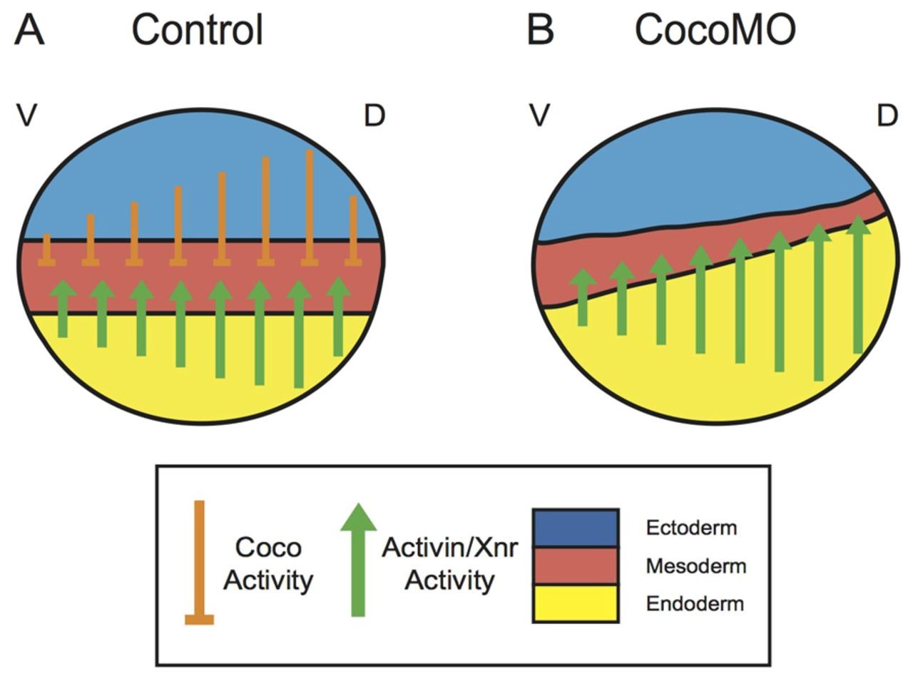Fig. 4. Coco controls germ layer specification via an inhibition of both Activin and Nodal signals. (A) A dorsoventral gradient of Coco activity (brown) restricts Activin and Xnr signals (green) from acting in the animal pole, ensuring correct spatial organization of the germ layers. (B) Knockdown of Coco allows dorsal marginal Activin and Nodal signals to become active in a more animal domain, disrupting mesoderm and endoderm formation resulting in a loss of anterior structures. D, dorsal; V, ventral.