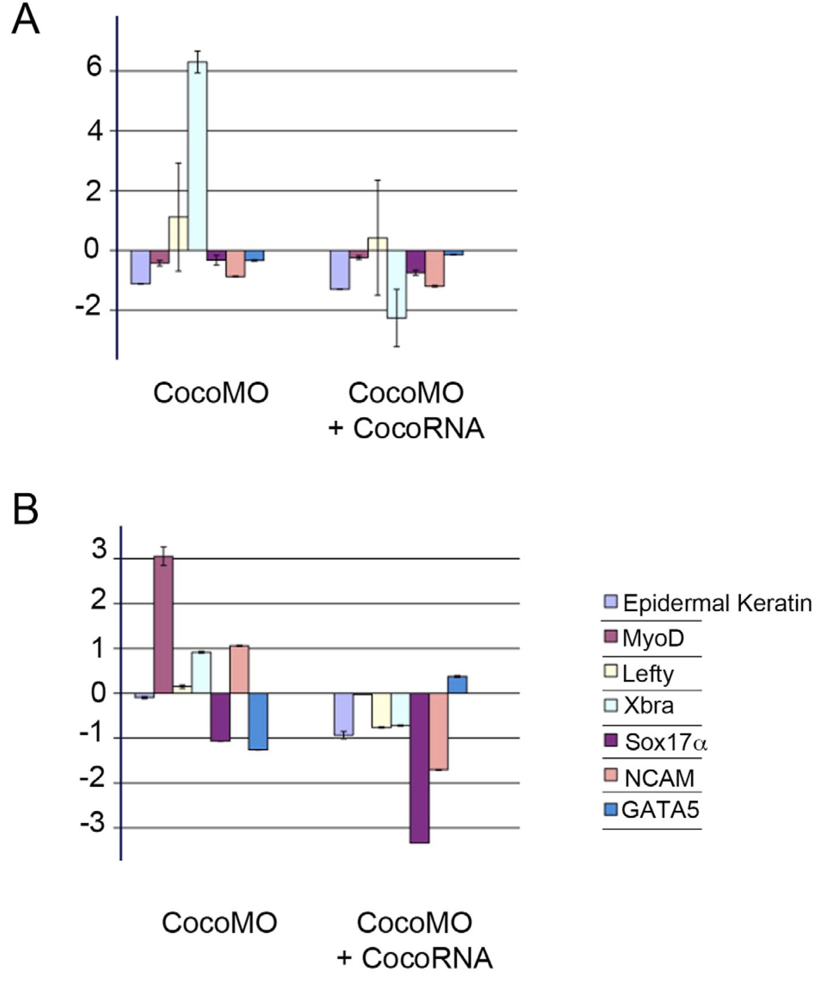 Suppl. Figure 3: qRT-PCR of explants from st16 Coco morphant embryos. (A) Animal caps from Coco depleted embryos were analysed for a variety of molecular markers. A strong upregulation of Xbra was detected. (B) Analysis of equatorial region of the embryo also had an increase in mesodermal markers, as seen by the upregulation of MyoD. y-axis: expression ratio (2-log scale)