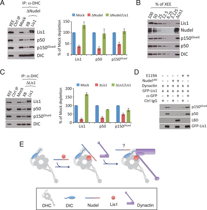 Lis1, Nudel/NudE, and dynactin are regulators of cytoplasmic dynein, a minus end-directed, microtubule (MT)-based motor required for proper spindle assembly and orientation. In vitro studies have shown that dynactin promotes processive movement of dynein on MTs, whereas Lis1 causes dynein to enter a persistent force-generating state (referred to here as dynein stall). Yet how the activities of Lis1, Nudel/NudE, and dynactin are coordinated to regulate dynein remains poorly understood in vivo. Working in Xenopus egg extracts, we show that Nudel/NudE facilitates the binding of Lis1 to dynein, which enhances the recruitment of dynactin to dynein. We further report a novel Lis1-dependent dynein-dynactin interaction that is essential for the organization of mitotic spindle poles. Finally, using assays for MT gliding and spindle assembly, we demonstrate an antagonistic relationship between Lis1 and dynactin that allows dynactin to relieve Lis1-induced dynein stall on MTs. Our findings suggest the interesting possibility that Lis1 and dynactin could alternately engage with dynein to allow the motor to promote spindle assembly.