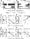 Figure 5. The response to playbacks was altered by CeA lesion. A, The time to suppression of calling (left y-axis) and the time to the resumption of calling (right y-axis) during playback are plotted for advertisement (Ad), rapping, and ticking. Sham-lesioned males suppressed earlier and resumed calling later during advertisement playbacks than rap playbacks (stars; Friedman, Dunn's multiple comparison, Q = 6.5, p = 0.03 for suppression; Q = 9.2, p = 0.006 for resumption). Advertisement playbacks were 15 min long; rap and tick playbacks were 5 min long, so that the x-axis is normalized for the duration of each playback. B, Using the same conventions as in A, CeA-lesioned animals show prolonged vocal suppression during advertisement, rap, and ticking playbacks. After IBO or electrolytic lesion, there was no significant difference in the time to suppression or resumption of calling during any playback (suppression: Friedman, IBO, Q = 6.0, p = 0.057; electrolytic, Q = 3.211, p = 0.1873; resumption: Friedman, IBO, Q = 0.9630, p = 0.5690; electrolytic, Q = 3.0, p = 0.2223). C, D, The prelesion to postlesion change in time to suppression (C) and time to resumption (D) was correlated with the number of cells remaining in the posterior CeA after lesion. The x-axes are reversed, with higher cell counts on the left and lower on the right. The y-axis was calculated as ([post lesion behavior] − [prelesion behavior]), so positive numbers indicate greater postlesion values. The fewer cells remaining in the CeA, the more rapid the time to calling suppression (C, Pearson's r = 0.54, p = 0.020) and the longer the time until call resumption (D, Pearson's r = −0.62, p = 0.01). E, F, The prelesion to postlesion change in the duration of calling during rapping (E) and ticking (F) playbacks was correlated with the number of cells remaining in the posterior CeA after lesion. The fewer cells remaining in the CeA, the less animals called during rapping (E, Pearson's r = 0.69, p = 0.001) or ticking (F, Pearson's r = 0.68, p = 0.001). |