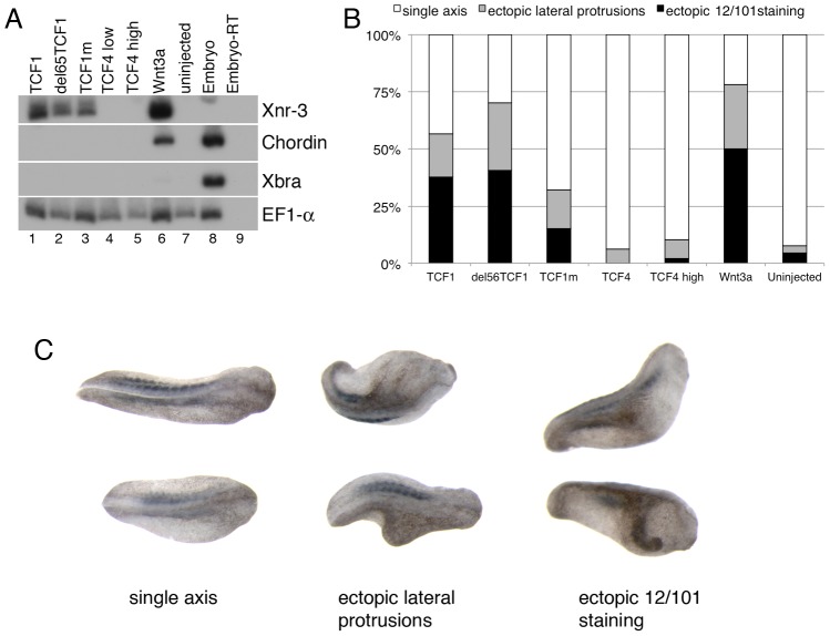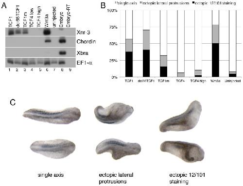 Figure 3. TCF1 activity in Xenopus laevis explants and embryos.(A) Wnt3a, wild-type and β-catenin-independent mutants of TCF1, but not TCF4, induce expression of the canonical Wnt pathway-responsive gene Xnr3 in ectodermal (animal cap) explants. RT-PCR analysis of animal caps dissected at late blastula stages and cultured until stage 10.5. EF1-α is used as a loading control. The âRT lane contains all reagents except reverse transcriptase, and is used as a negative control. (B) Graph depicting embryonic perturbation by Wnt3a, TCF4, and wild-type and mutant TCF1. Embryos were injected in the ventral marginal zone at early cleavage stages and cultured until late tailbud stages. For (A) and (B), 1 ng (TCF4 high) or 500 pg (TCF1, del65TCF1, TCF1m, TCF4low, Wnt3a) of each RNA was injected, as listed. (C) Representative embryos recorded in the graph shown in (B). Dorsal views; anterior is to right. All embryos in (C) were injected with RNA encoding del65TCF1. Staining with the 12/101 antibody, which recognizes a somite specific epitope, was used to assess axis duplication.