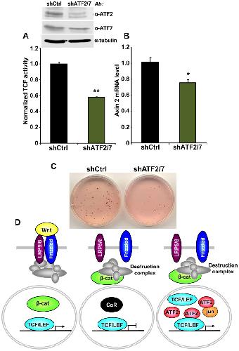 Figure 6. ATF2 and ATF7 knockdown in Ramos cells decreases TCF/LEF activity, Axin 2 expression and cell growth.(AâC) Ramos cells containing the TCF/LEF firefly and renilla luciferase lentiviral reporters were transduced with shATF2 and shATF7 or control lentiviral vectors. ATF2 and ATF7 down-regulation assessed by immunoblot analysis. (A) shATF2/7 inhibits constitutive TCF/LEF reporter activity in Ramos cells. (B) Knockdown of ATF2 and ATF7 reduces the expression of the Wnt target gene Axin 2 in Ramos cells as measured by quantitative real-time PCR. The results normalized to the control represent the mean values ± SEM of three independent experiments. (*) P<0.05; (**) P<0.001 compared with control (two-way Anova test) (C) shATF2/7 inhibits Ramos cell colony formation. (D) Model for β-catenin-dependent and β-catenin-independent canonical Wnt signaling. See the text for details.