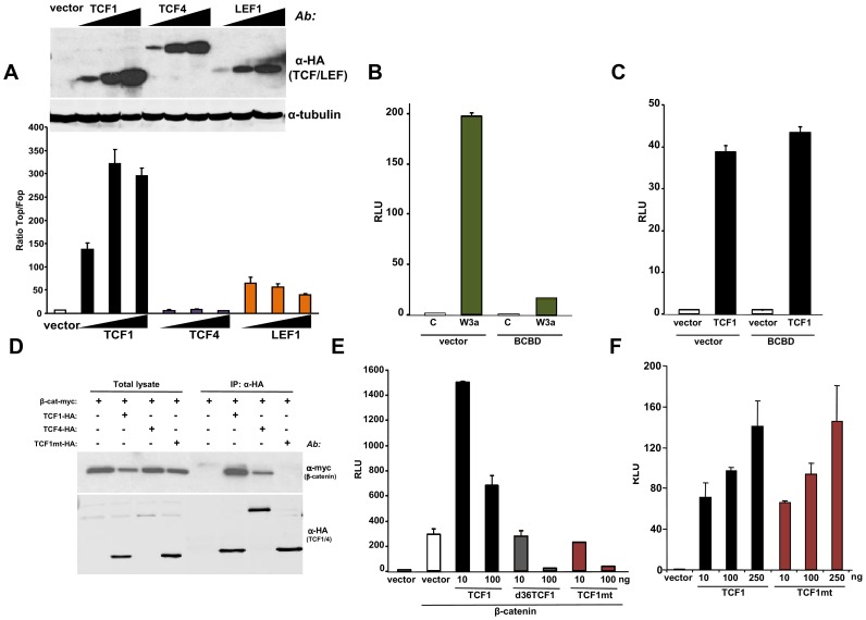 Figure 2. β-catenin-independent transcriptional activity of TCF1/LEF1 factors.(A) Empty pcDNA3HA vector or increasing amounts of HA-tagged TCF1, LEF1 or TCF4 constructs were co-transfected with SuperTop or SuperFop and renilla luciferase plasmids in 293T cells and the Top/Fop ratio was calculated. (BâC) Effects of a decoy construct containing TCF1β-catenin binding domain (BCBD) on Wnt3a- and TCF1-induced TCF/LEF reporter activity. 293T cells were co-transfected with SuperTop and renilla reporter plasmids, together with the Wnt3a, TCF1 and BCBD vectors as indicated. (DâE) Mutant TCF1 (mtTCF1; D21A, E29K) is unable to bind to β-catenin. (D) 293T cells were transfected with the indicated HA-tagged TCF1 or TCF4 constructs and the myc-tagged β-catenin, followed by immunoprecipitation using anti-HA antibody and immunoblot with anti-myc or anti-HA antibodies. (E) 3T3 cells were co-transfected with β-catenin, the indicated amounts of TCF1, d36TCF1 or mtTCF1, together with SuperTop and renilla luciferase plasmids. (F) Effects of TCF1 and mtTCF1 expression on TCF/LEF reporter activity. 293T cells were co-transfected with SuperTop and renilla luciferase plasmids and different amounts of TCF1 or mtTCF1, followed by reporter assay.