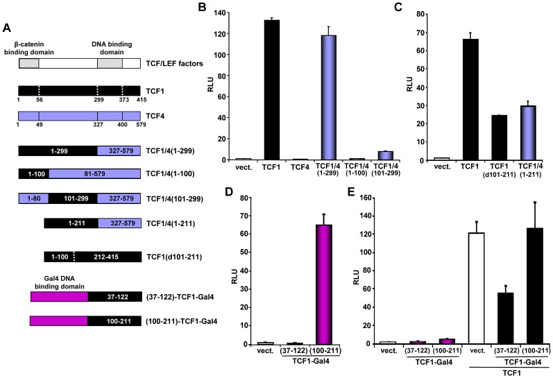 Figure 4. Mapping of the TCF1 domains involved in β-catenin-independent transcriptional activity.(A) Diagram of the different constructs used for the mapping. (BâD) 293T cells were co-transfected with the SuperTop reporter, the renilla plasmid and the indicated constructs, followed by reporter assay two days after transfection. (B) TCF1 N-terminal domain is required, but not sufficient, for β-catenin-independent full transcriptional activity. (C) Deletion of either aa 101â211 or 212â299 inhibits the β-catenin-independent transcriptional activity of TCF1. (D) Transcriptional activity of two different TCF1 domains fused to the Gal4 DNA binding domain. 293T cells were co-transfected with a Gal4 responsive reporter and the indicated TCF1-Gal4 fusion constructs, followed by reporter assay. (E) Expression of TCF1 aa 37â122, but not aa 100â211, inhibits TCF1-induced reporter activity. 293T cells were co-transfected with the Supertop reporter and the indicated TCF1-Gal4 fusion constructs, in the presence or the absence of TCF1, followed by reporter assay two days after transfection.