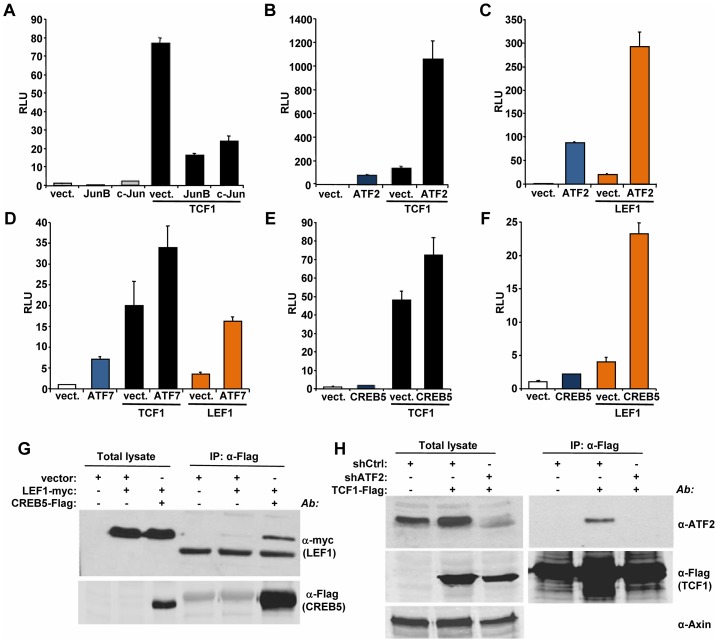 Figure 5. ATF2 transcription factors cooperate with TCF1/LEF1 to stimulate TCF/LEF activity.(A–F) 293T cells were co-transfected with the Supertop reporter, the renilla plasmid and the indicated TCF/LEF or AP1 transcription factors, followed by TCF/LEF reporter assay two days after transfection. (A) c-Jun and JunB inhibition of TCF1-induced reporter activity. (B–C) ATF2 synergizes with TCF1 (B) and LEF1 (C) to increase TCF/LEF activity. (D) ATF7 enhances TCF1- and LEF1-induced reporter activity. (E–F) CREB5 cooperated with TCF1 (E) and LEF1 (F). (G) myc-tagged LEF1 co-immunoprecipitates with Flag-tagged CREB5 in 293T cells. (H) Endogenous ATF2 co-immunoprecipitates with Flag-tagged TCF1 in 293T cells. Cells transduced with lentiviral shATF2 were used as a negative control and immunoblot with anti-Axin antibody was used as loading control for the total lysate.