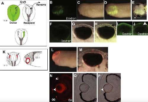 Fig. 6. NCCs contribute to the Xenopus cornea. (A) Schematic drawing of the labeled NCC grafting experiment. (BâD) Fluorescent (B), brightfield (C) and overlaid (D) images of a grafted embryo at stage 26 showing grafted tissue developing into three migrating streams of cranial neural crest. (E) Overlaid image of the ventral view of a grafted embryo at stage 45. Grafted side is labeled with an asterisk. (FâH) Fluorescent (F), brightfield (G) and overlaid (H) images of an eye at stage 45. The fluorescent inner cornea is indicated with an arrow. (IâJ) Fluorescent images of the eyes of a donor embryo at stage 45. Image (I) shows the eye on the side where cranial NCCs had been removed. Image (J) shows the eye on the control side. Intact inner cornea is indicated with an arrowhead. (K) Schematic drawing of DiI labeling experiment. (L) Overlaid image of the labeled embryo at stage 26. (M) Overlaid image of the eye at stage 45. (NâP) Fluorescent (N), brightfield (O) and overlaid (P) images of the cross-section of a DiI labeled eye. Abbreviations: OC, outer cornea; IC, inner cornea.