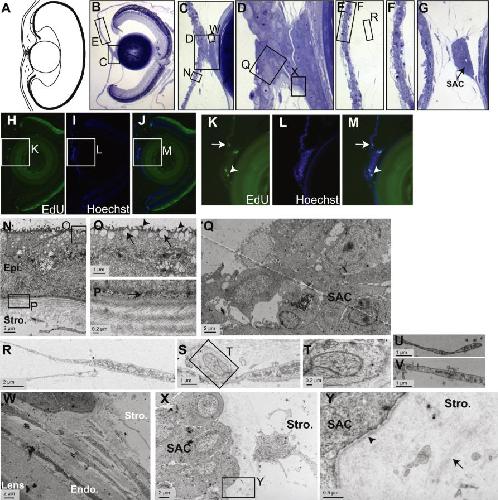 Fig. 7. Xenopus cornea at stages 48â50. (A) Schematic drawing of stage 48â50 eye. (BâG) Plastic section images of stage 48â50 eye (B), cornea (C), the SAC (D), the epithelium (E, F) and the SAC present in a different eye (G). (HâM) Proliferation assay showing dividing cells in the epithelium (arrow) and in the SAC (arrowhead). EdU (H, K), Hoechst (I, L), and overlaid (J, M). (NâY) EM images of a plastic section adjacent to that displayed in panels BâF. (N) EM image showing the transitional epithelium and the anterior stroma. (OâP) Epithelial cells possess both microvilli (arrowheads) and vesicular structures (arrows) on the apical membrane (O) and are underlined by numerous dark staining particles (arrow in P). (Q) EM image showing anterior side of the SAC. (RâV) Details of the keratocytes. (T) High magnification image of one keratocyte containing a vesicle filled with short collagen fibrils. (W) EM image showing the posterior side of the SAC and the endothelium. (XâY) EM images showing the lateral side of the SAC. Collagen fibrils are indicated by arrows and a boundary structure surrounding the SAC is marked by an arrowhead. Abbreviations: epi, epithelium; stro, stroma; SAC, stroma attracting center; endo, endothelium.