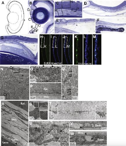 Fig. 9. Xenopus cornea at stage 55â60. (A) Schematic drawing of stage 55â60 eye. (B) Histology of stage 55â60 eye at low magnification. (CâG) Plastic section images of the different regions in the anterior part of the eye as indicated in (B). (HâM) Proliferation assay. EdU (H, K), Hoechst (I, L), and overlaid (J, M). (NâR) EM images of a plastic section adjacent to that displayed in panels BâG showing the primary corneal epithelium layer (N), the apical cell membrane (O), basement membrane (P) and intercellular junctions (Q). (R) EM image showing the corneal stroma and endothelium. (SâT) High magnification images showing the typical contents of a keratocyte (S), and the long and thin processes of a typical keratocyte (T). (U) Cross-sections of collagen fibrils (arrows) were occasionally observed in keratocytes. (VâW) EM images showing the developing corneal endothelium. In (V), intracellular vacuole is indicated by an arrow. In (W), arrow indicates a group of collagen fibers in the endothelial layer; arrowhead shows the presence of an early Descemet's membrane. Abbreviations: epi, epithelium; stro, stroma; endo, endothelium.
