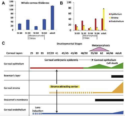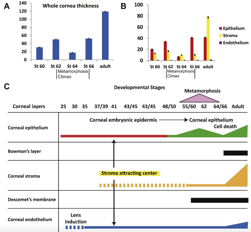 Fig. 14. Thickness measurement and summary of Xenopus cornea development. (AâB) Thickness measurement of the entire cornea (A) and separate layers (B) from stage 60 to adult. (C) Diagram summarizing the developmental timescale of all corneal layers. Thickness of the bars corresponds to the size of the tissue. Broken bar suggests periods of mesenchymal invasion in the formation of corneal stroma and endothelium.