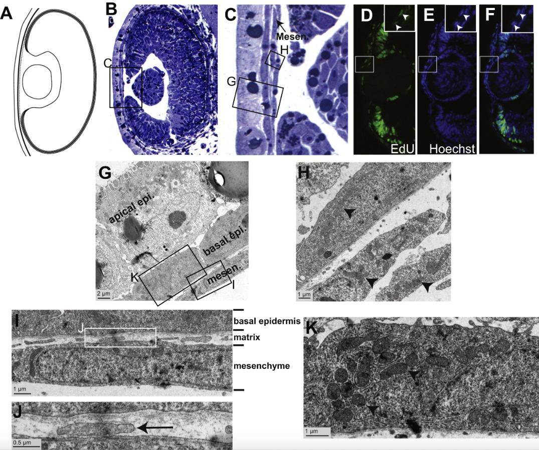 Fig. 2. Xenopus cornea at stage 35. (A) Schematic drawing of stage 35 eye. (BâC) Plastic section images of stage 35 eye (B) and cornea (C). Mesenchyme (arrow in C) is found lining the entire length of the basal epidermis. (DâF) Proliferation assay showing dividing cells in the epidermis (arrowheads in insets). EdU (D), Hoechst (E), and overlaid (F). (GâK) EM images of a plastic section adjacent to that displayed in panels B and C showing that the cornea at this stage is composed of two epidermis layers, a thin matrix and some mesenchymal cells. (G) The mesenchymal cells have not yet formed a monolayer (H) and their high cellular activity is suggested by the presence of many mitochondria (arrowheads) in the cytoplasm. (IâJ) High magnification EM images showing the thin matrix in the cornea (I), where cross-sections of mesenchymal cell processes (J) are observed. (K) Basal epidermis cell shows dark staining in EM and cellular organelles such as ER and mitochondria (arrowheads) are abundant in their cytoplasm. Abbreviations: mesen, mesenchyme; apical epi, apical epithelium; basal epi, basal epithelium.