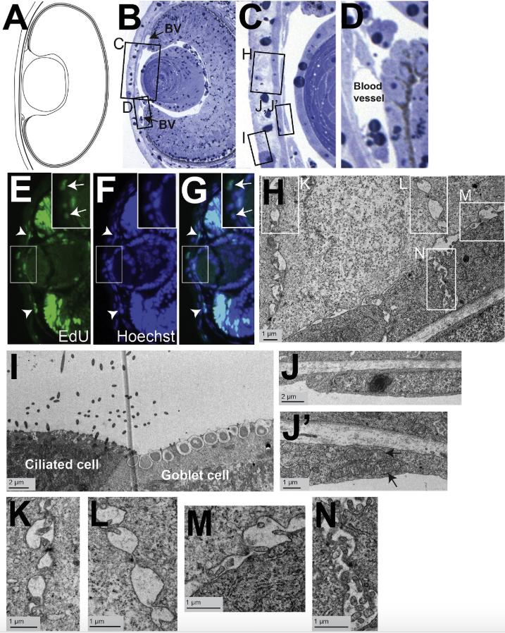 Fig. 3. Xenopus cornea at stages 37â39. (A) Schematic drawing of stage 37â39 eye. (BâD) Plastic section image of stage 37â39 eye (B), cornea (C) and the developing episcleral vasculature (D). (EâG) Proliferation assay showing positively labeled cells in the cornea (arrows in insets) as well as in the developing vasculature (arrowheads). EdU (E), Hoechst (F), and overlaid (G). (HâN) EM images of a plastic section adjacent to that displayed in panels BâD showing details in the stage 37â39 cornea. The cornea is composed of four distinct layers (H) at this stage. The cornea anterior surface is formed by goblet cells and more darkly stained ciliated cells (I). The matrix layer appears thicker than at earlier stages (J, Jâ²) and the mesenchymal cells are arranged into a monolayer named the presumptive corneal endothelium. Organelles such as mitochondria (arrows) are sometimes observed in the cytoplasm. (KâN) High magnification images of the developing intercellular connections in the cornea epidermis. Abbreviations: BV, blood vessel.